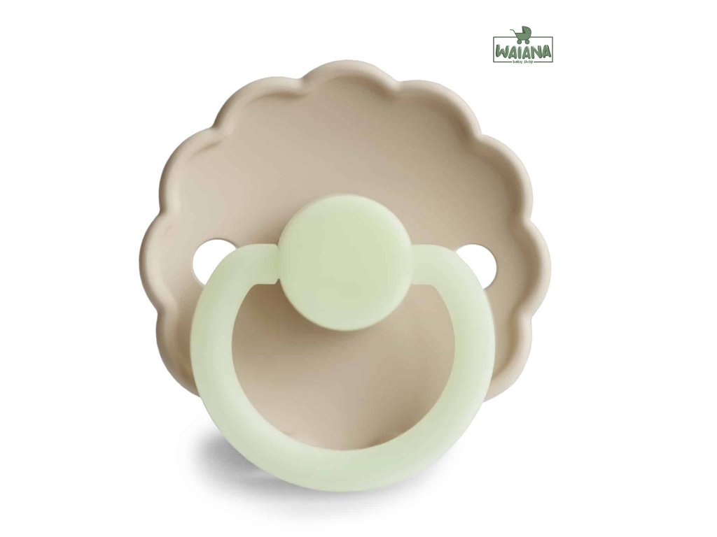 Silikónový cumlík, vhodný pre deti od 0-6 mesiacov, svietiaci v tme, so vzorom kvietka.