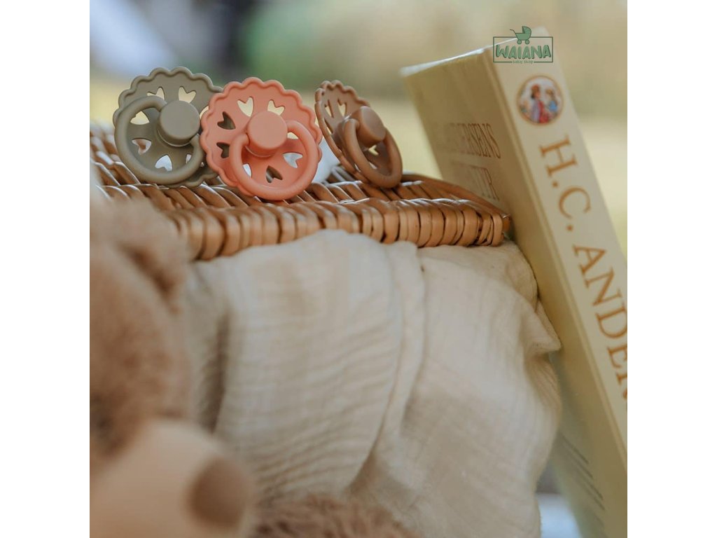 Kolekcia cumlíkov FRIGG Fairytale je inšpirovaná umeleckou tvorbou dánskeho autora H.C. Andersena. Vrúbkované okraje a malé srdiečka vo vnútri štítu napodobňujú jeden z jeho papierových výstrižkov. Každá farba cumlíka je pomenovaná podľa jeho známych rozprávok, ktoré dodávajú cumlíkom nádych fantázie. Tento mimoriadne krásny cumlík, s moderným dizajnom a elegantnými detailmi, upúta pozornosť každej štýlovej mamičky.
