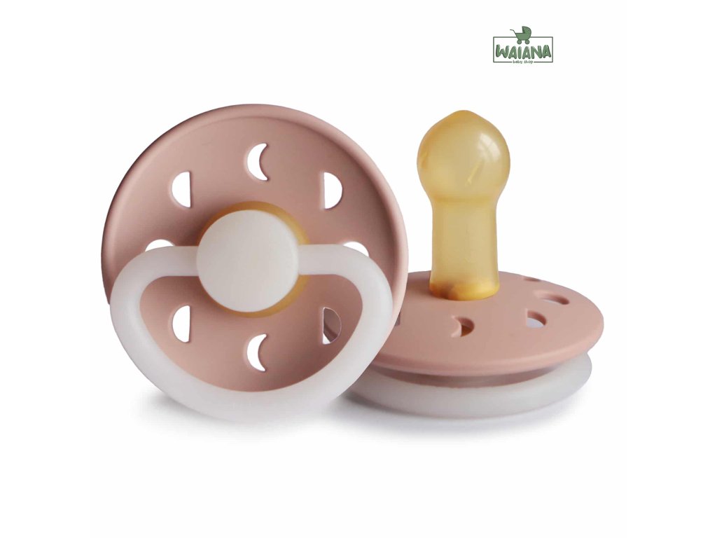 Kaučukový cumlík vhodný pre deti od 6 mesiacov, svietiaci v tme, so vzorom mesiacov.