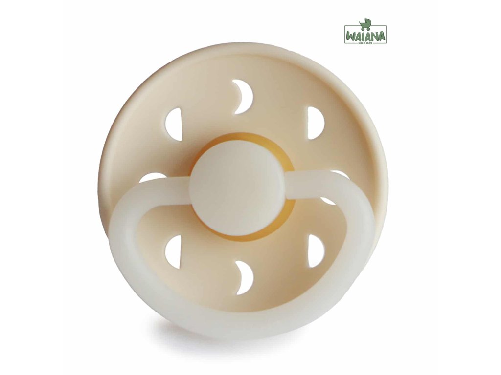 Kaučukový cumlík vhodný pre deti od 0-6 mesiacov, svietiaci v tme, so vzorom mesiacov.