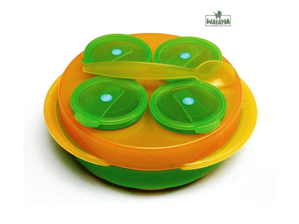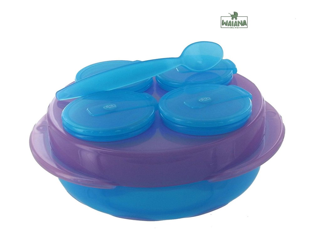 Táto sada bola navrhnutá pre cestovanie s dieťaťom. Rôzne časti potravy môžete uložiť samostatne do 100 ml nádobiek s vekom, a neskôr ich servírovať na tanieriku lyžicou. Všetky časti sady môžu byť umyté v umývačke riadu v hornom košíku. Tanier i dózy bez viečka môžete vložiť do mikrovlnnej rúry. Uzavreté dózy môžete dať do mrazničky.