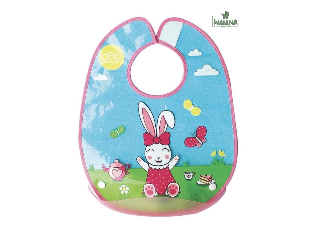 Podbradník s korýtkom dokonale ochráni oblečenie Vášho dieťaťa. Teraz s motívom ružového zajačika. Modrý úplet s froté podšívkou potiahnutý priehľadným potlačeným plastom. Plastové korýtko je možné odopnúť. Nastavitelné zapínání u krku na suchý zip.