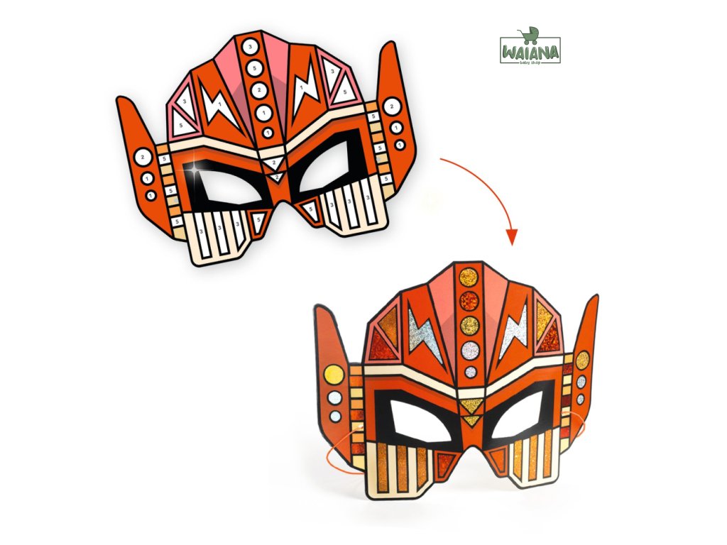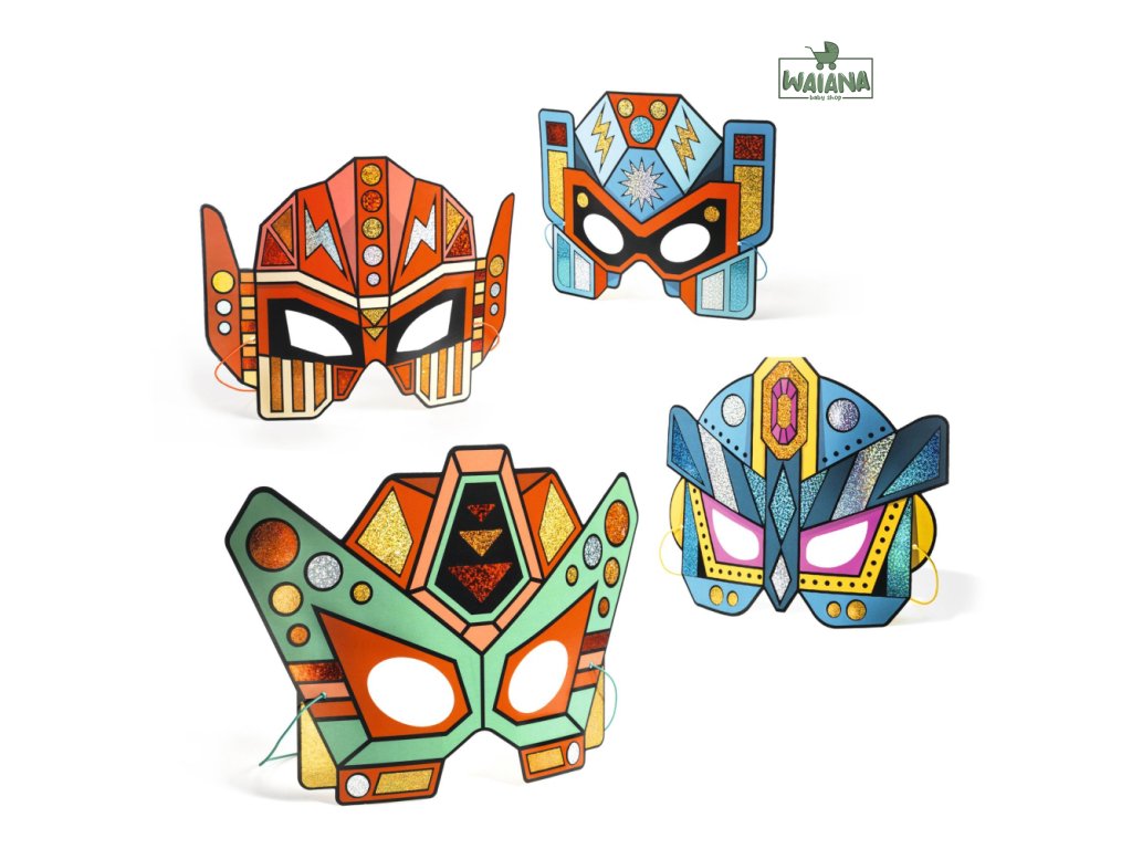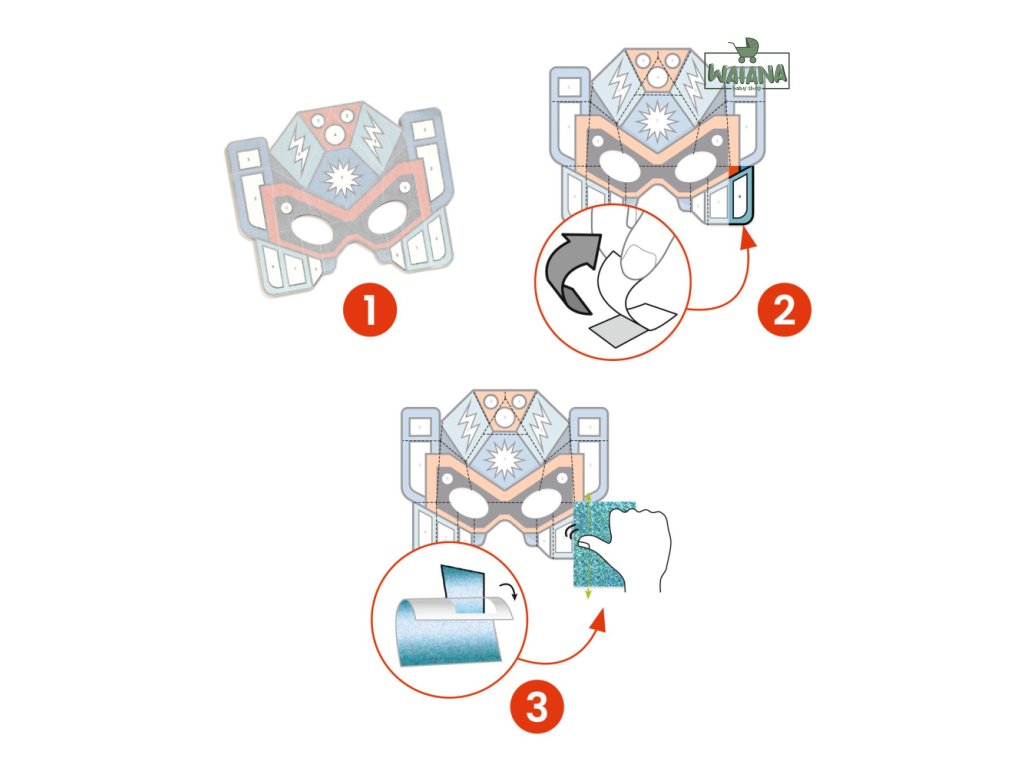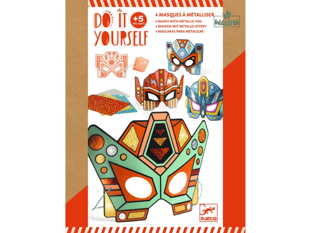 DIY Vyrob si sám Masky Roboti Vytvor si vlastné masky super robotov. Kreatívna sada štyroch masiek super robotov na ozdobenie farebnými fóliami s metalickým leskom. Na ilustrovaných maskách sú lepivé plôšky, vďaka čomu je aktivita čistá, bez potreby použiť lepidlo. Dieťa pritlačí hárok fólie určitej farby na lepivú plôšku, hárok stiahne a plôška zostane polepená metalicky lesklou fóliou. Takto vyplní všetky plôšky.Deti si precvičia jemnú motoriku a koncentráciu. Pre každú masku je pribalená elastická šnúrka, ktorú pristrihnete podľa obvodu hlavy a uviažete na masku. Sada je výborná na spoločné tvorenie a hru viacerých detí. Sada je vyrobená z papiera a lepenky s ekologickým certifikátom FSC®. Kolekcia DIY (Vytvor si sám) má blízko k úžitkovému umeniu a umožňuje deťom zhotoviť umelecké výrobky, ktoré si môžu nielen hrdo vystaviť, ale ich aj používať. Obsah: 4 masky s lepivými plôškami, 30 hárkov farebných fólií s metalickým leskom, 4 farebné elastické šnúrky (gumičky), 1 obrázkový návod. Rozmery masiek: 22 x 16 cm.