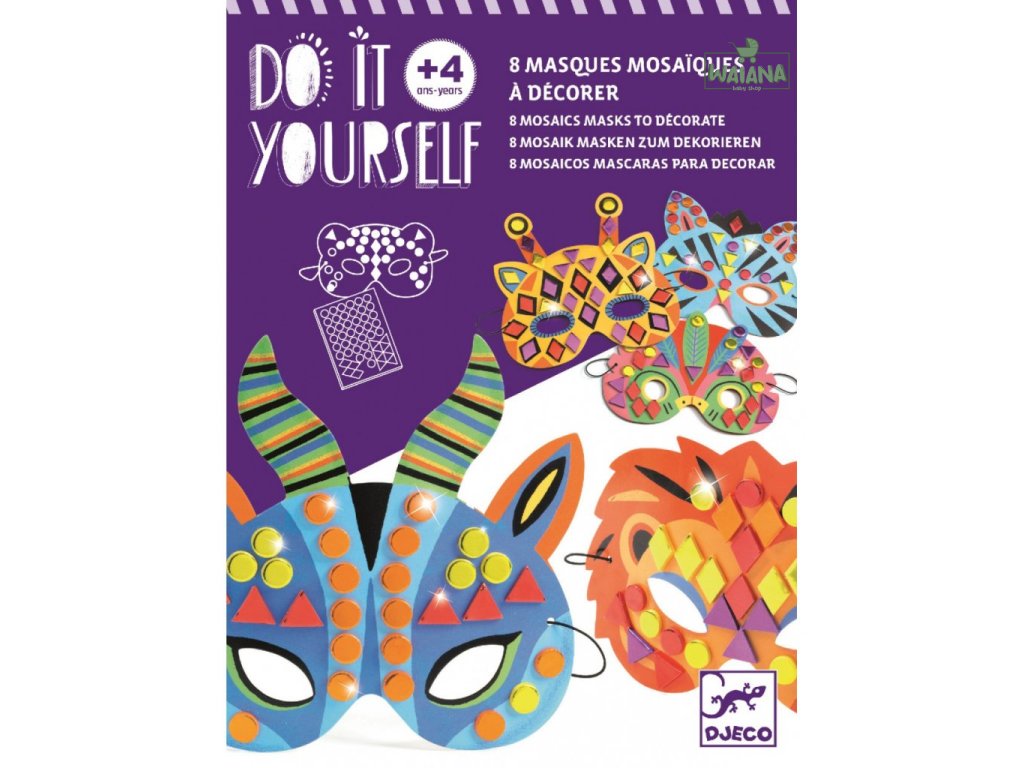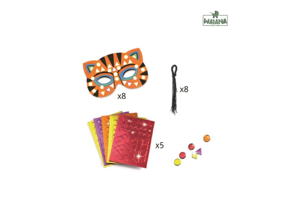 DIY Vyrob si sám Masky Zvieratá z džungle Vyrob si 8 masiek na oči! Keď ťa baví karneval, masky alebo hra na nejaké zviera, tak pomocou DIY sady Masky – Zvieratá džungle si môžeš vyrobiť až 8 rôznych masiek na oči. Masky sú z ohybného kartónu s výrezmi na oči. Netreba nič vyfarbovať, masky už majú potlač, stačí na biele miesta dolepiť mozaikové nálepky. Nálepky majú metalický vzhľad, čím dodajú maskám nápadný, efektný lesk. Na záver uviažeš na okraje masky gumku a môžeš si ju nasadiť na oči.