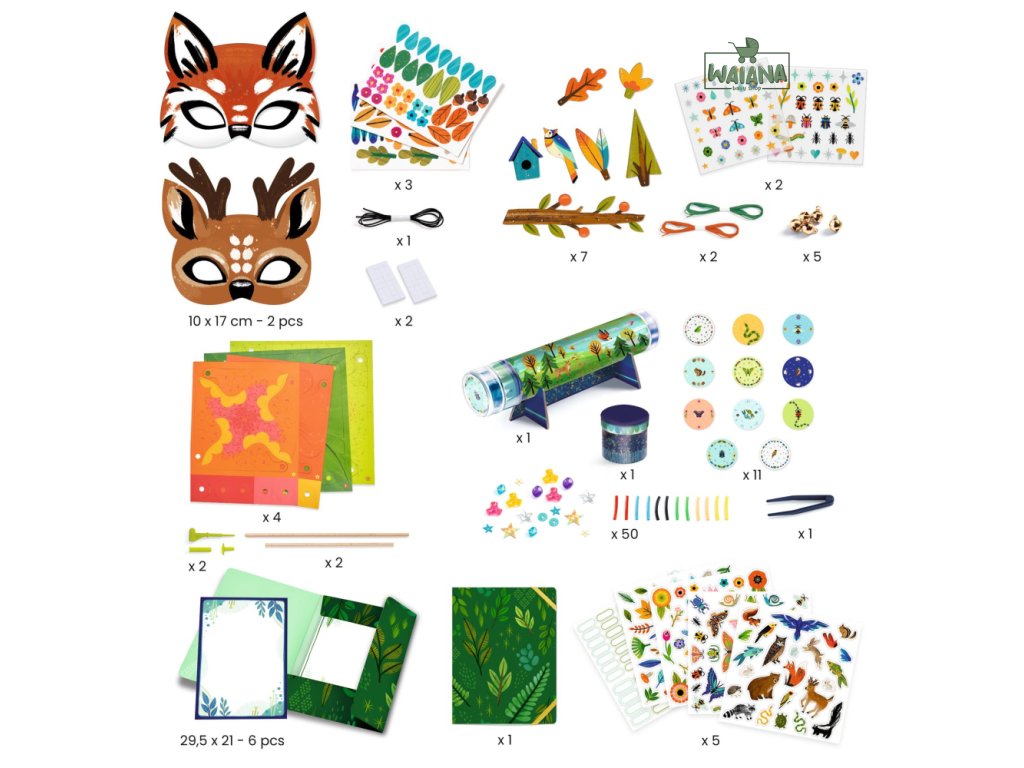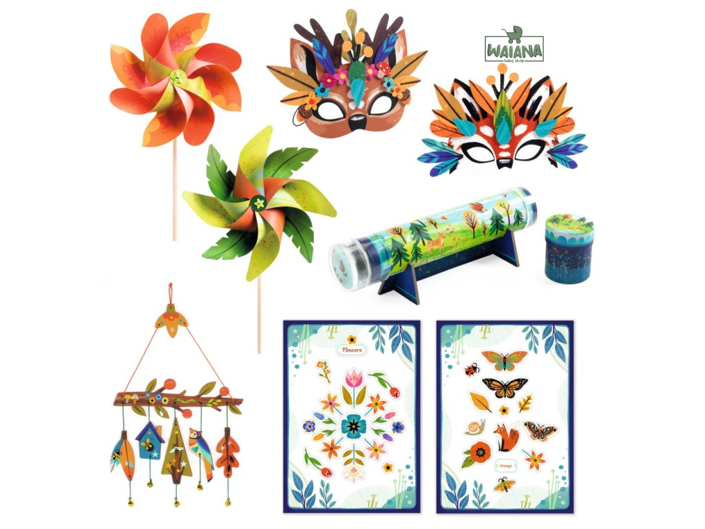 Príroda v strede záujmu! Sada 5 kreatívnych aktivít obsahuje všetko potrebné na zhotovenie 12 výtvorov, ktoré spája téma prírody. Vzniknú 2 zvieracie masky (hráme sa na zvieratá), 2 vrtuľky a 1 zvonkohra (hráme sa s vetrom), 6 plagátikov (vytvárame kategórie) a 1 kaleidoskop (pozorovanie je magická činnosť). Sada vystačí na hodiny kreatívnej zábavy a je vhodná aj pre skupinku detí.Papier a kartón použitý na výrobu sady má ekologický certifikát FSC®. Kolekcia Vytvor si sám (DIY) má blízko k úžitkovému umeniu a umožňuje deťom zhotoviť umelecké výrobky, ktoré si môžu nielen hrdo vystaviť, ale ich aj používať.Obsah: 2 masky na ozdobenie: 80 ks ilustrovaných papierových dielov, 2 hárky obojstranných lepiek, 2 elastické šnúrky (gumky); 2 vrtuľky na poskladanie: 4 hárky s vyrezanými ilustrovanými dielmi, 2 drevené paličky, 2 plastové koncovky (čiapočky); 1 kaleidoskop na poskladanie: 1 ilustrovaný tubus, násada s krytkou (plast) na vloženie farebných dielikov a kotúčov na pozorovanie, 3 zrkadlá (zrkadlová fólia), 1 okulár so šošovkou (plast a papier), 1 pinzetka, 11 ilustrovaných kotúčov, 50 ks farebných dielikov, škatuľka s vekom na uskladnenie dielikov a kotúčov, ilustrovaný stojan; 6 obrázkov (plagátov) s prírodnými motívmi na dotvorenie: 4 hárky samolepiek (zvieratká a rastlinky), 1 hárok samolepiacich menoviek, odkladacia mapa s gumičkou; 1 závesná dekorácia (zvonkohra) na ozdobenie: 2 hárky obtlačkov, 7 ilustrovaných dielov, 2 ks farebných šnúr, 5 zvončekov; 1 obrázkový návod pre každú aktivitu