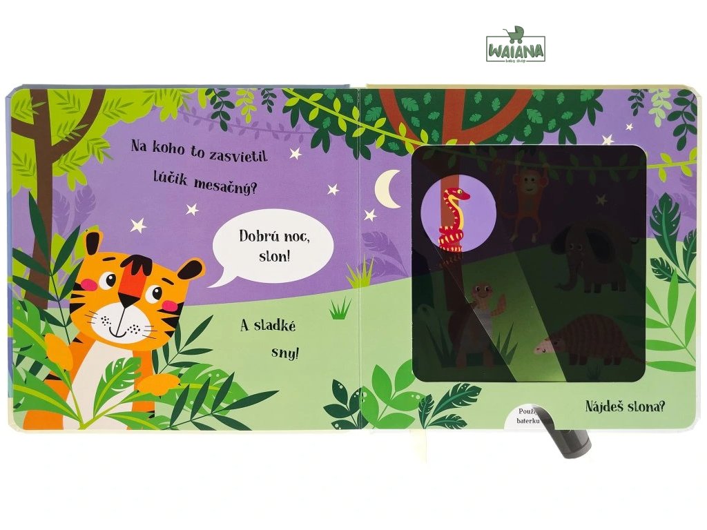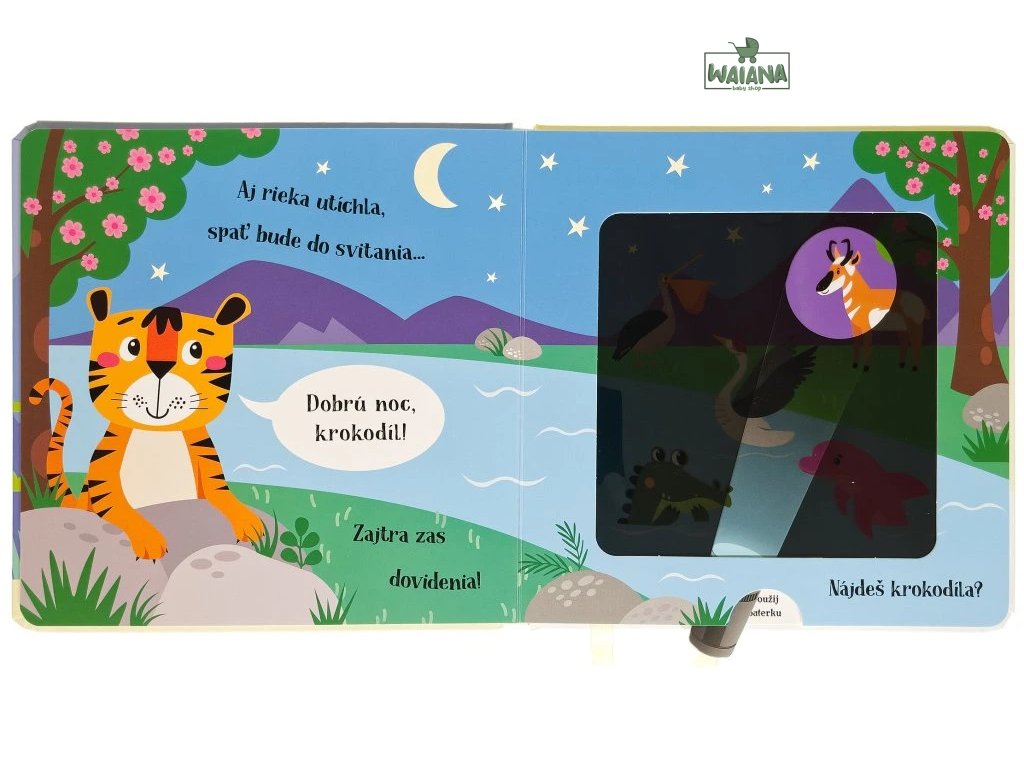 Dobrú noc, tigríča!Kúzelné čítanie na dobrú noc pre detiTigríča sa už chystá spať, ale najprv musí dať dobrú noc všetkým svojim zvieracím kamarátom. Pomôžeš mu ich nájsť?Kniha s kúzelnou baterkouPomôž tigríčaťu nájsť pomocou kúzelnej baterky všetkých jeho zvieracích kamarátov, ukrytých v knižke. Čítanie vo veršoch, ideálne do postieľok. Vsuň kúzelnú baterku medzi stránky a zisti, kto sa ukrýva v každej ilustrácii zobrazujúcej noc. Text vo veršoch učí deti vnímať prirodzený rytmus reči. Šikovne vyrobené okienka umožňujú deťom hľadať schované zvieratká pomocou priloženej kartónovej pomôcky v tvare svietidla. Ponúknite dieťaťu pred spaním nejakú upokojujúcu aktivitu. Táto knižka je na to priam stvorená.