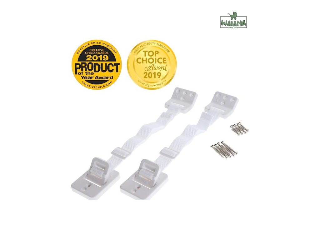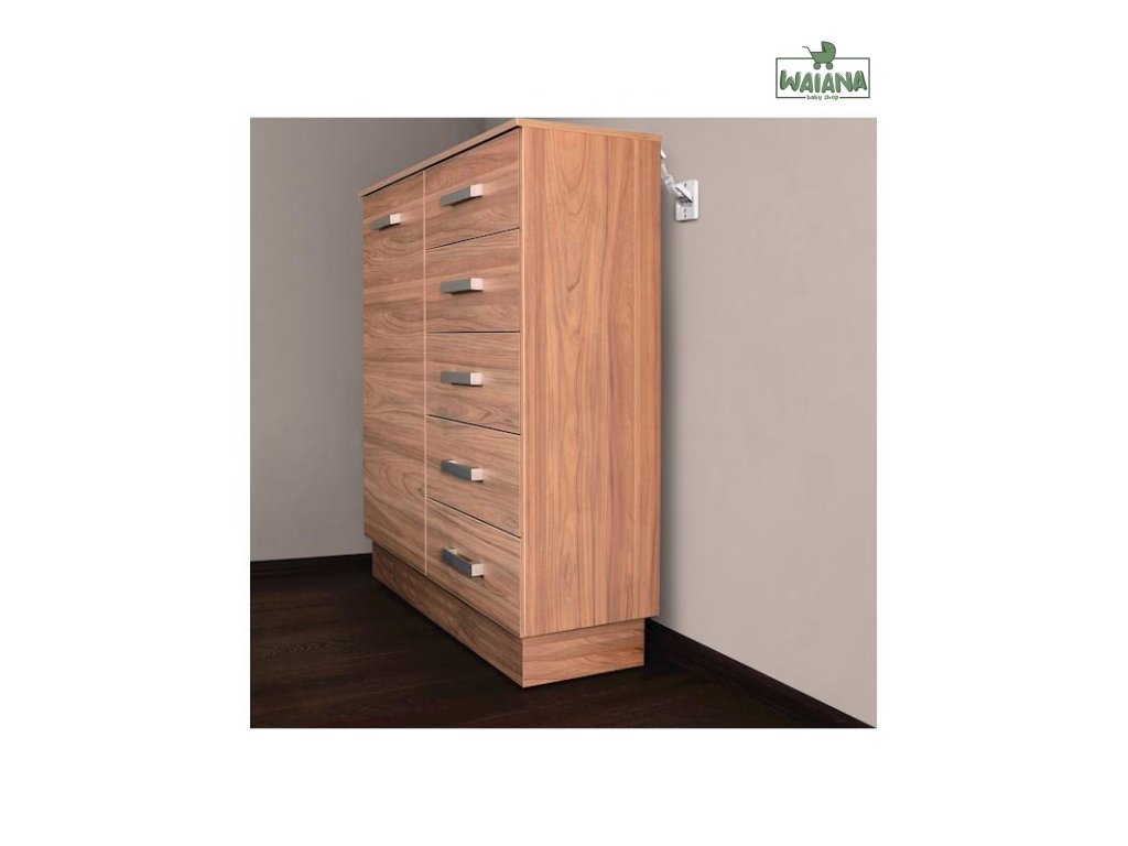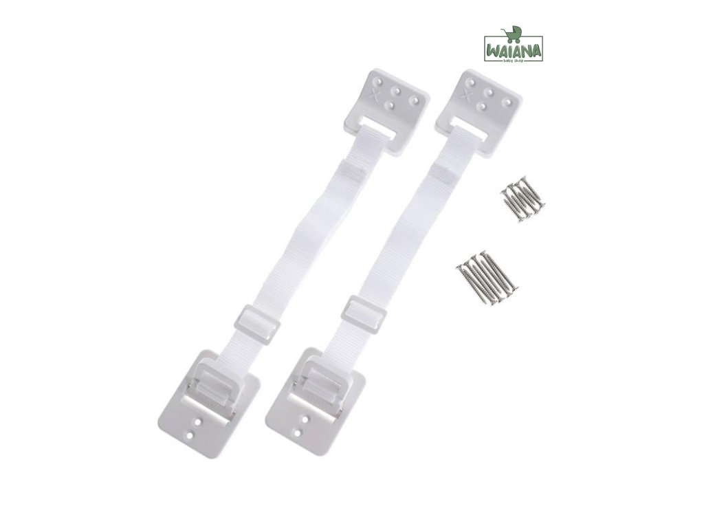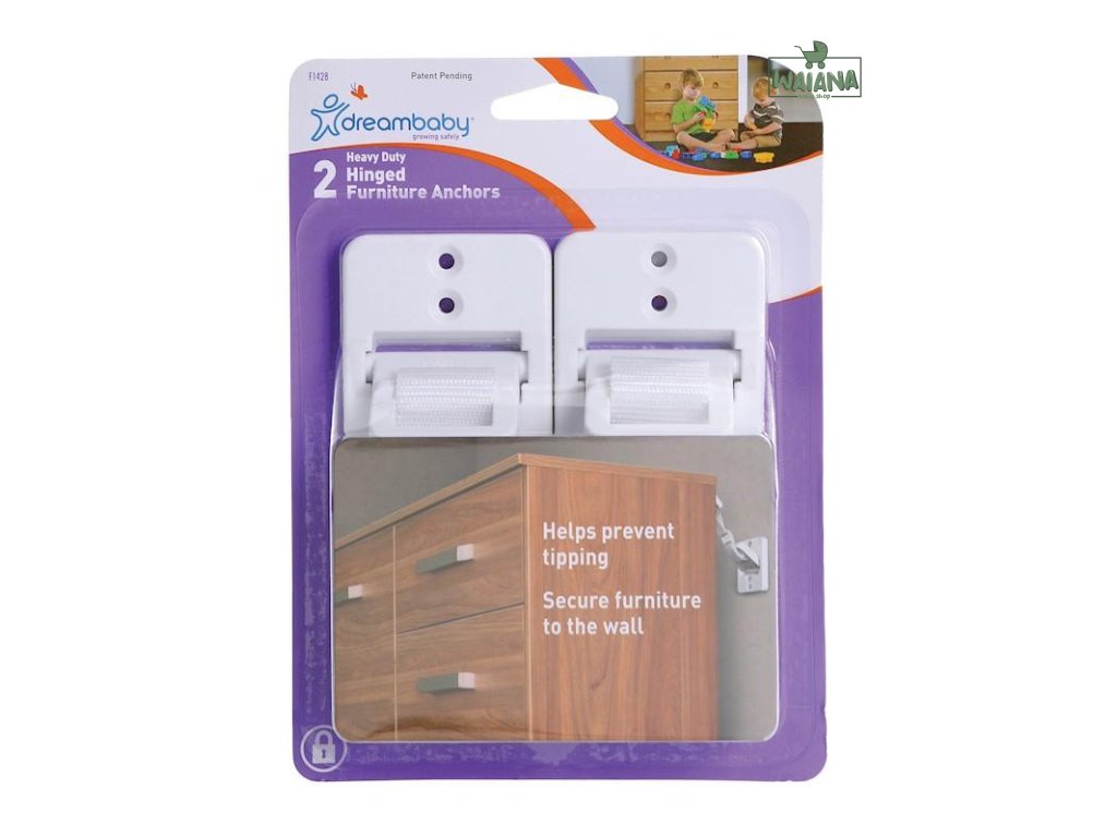 Úchyty Dreambaby pomáhajú upevniť nábytok k stene, aby sa zabránilo náhodnému prevráteniu. Nastaviteľné popruhy ich robia vhodnými na použitie na knižnice, komody, vitríny a ďalší nábytok