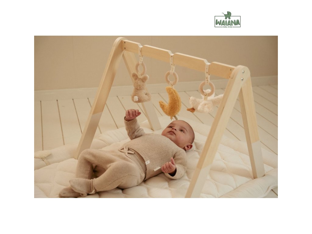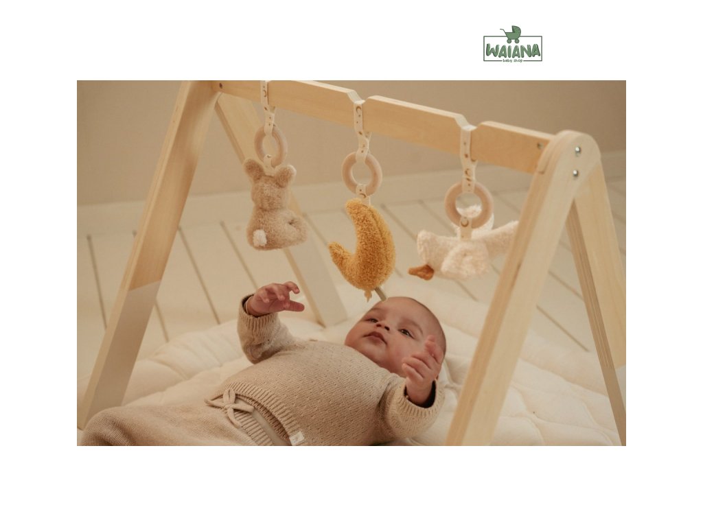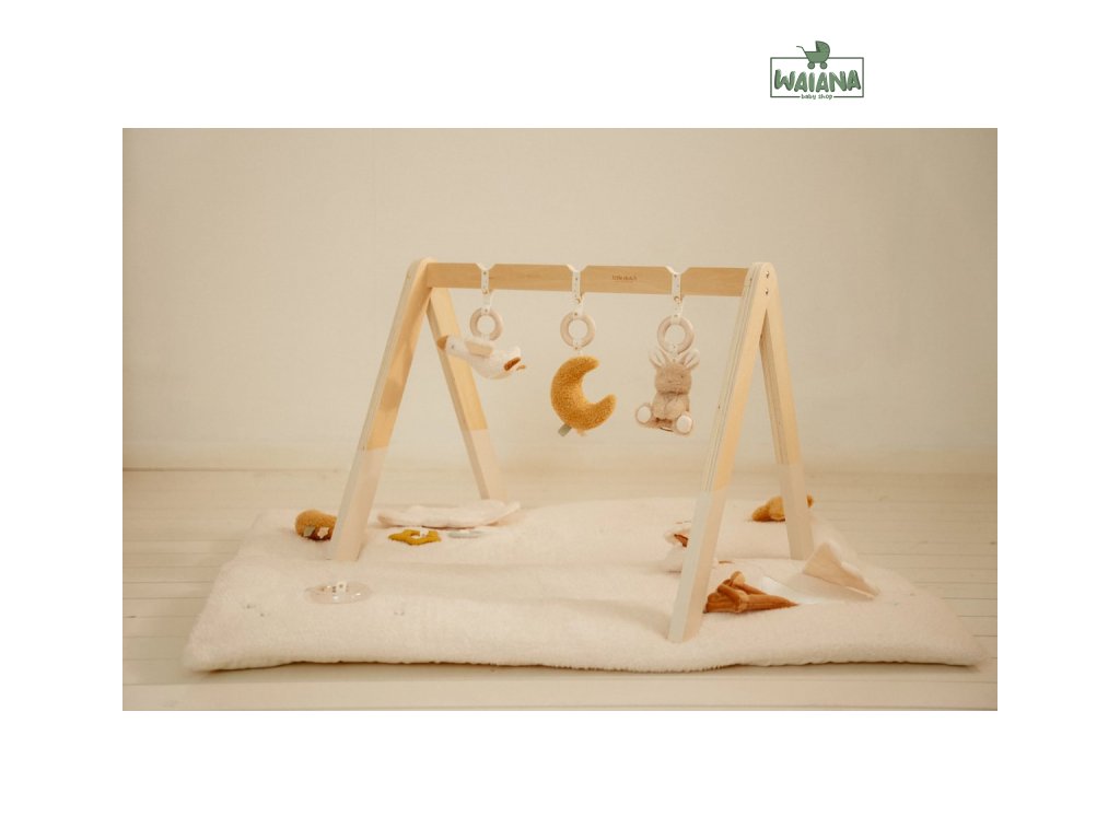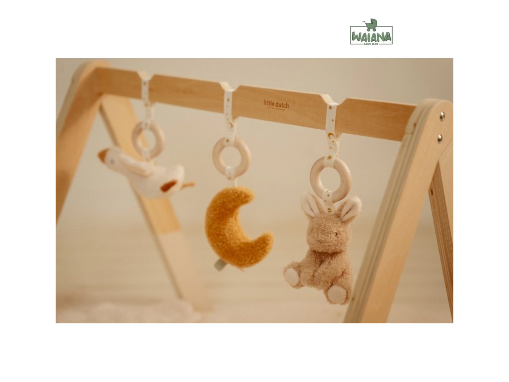 Štýlová drevená hrazdička s tromi zavesenými plyšovými hračkami v podobe králika, husi a mesiaca poskytne vášmu bábätku veľa zábavy pri hraní na deke. Jednotlivé hračky lákajú dieťa na skúmanie a dotýkanie, pri pohybe hrkajú a šuštia. Odnímateľné hračky je možné používať aj samostatne.