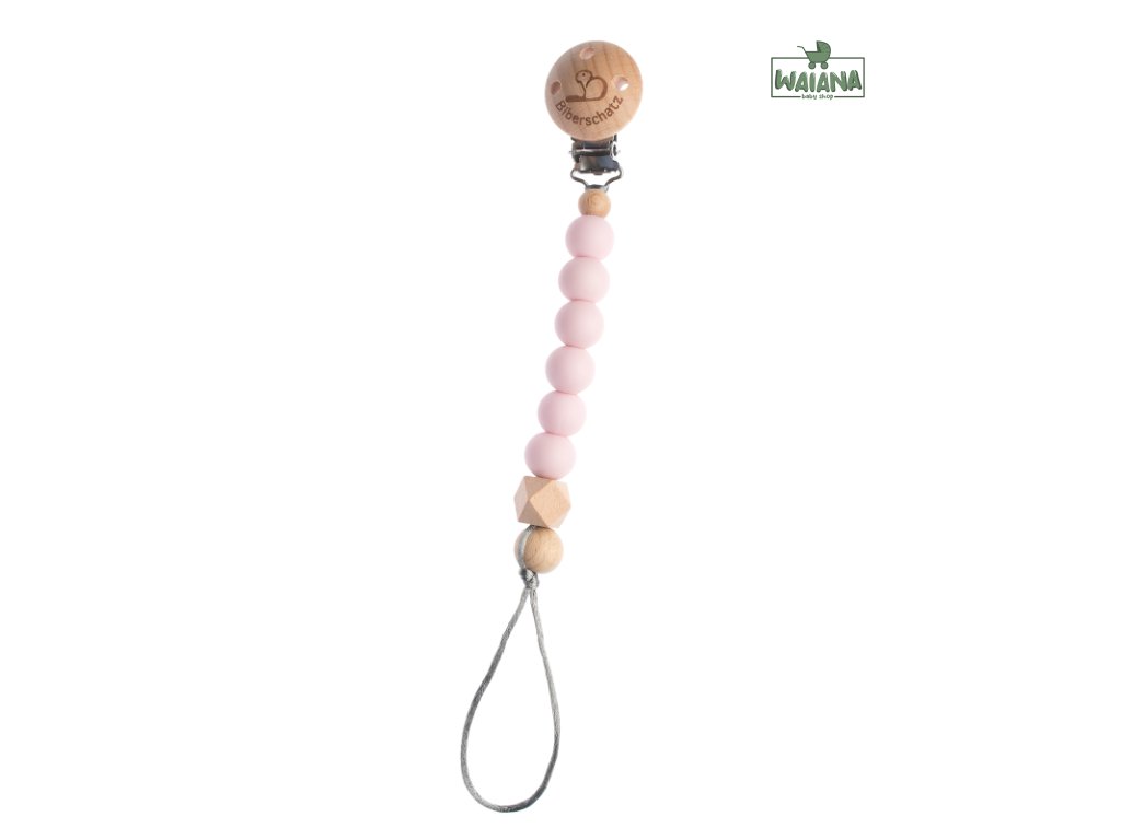 - vyrobený zo 100% hypoalergénneho silikónu, bukového dreva, saténovej šnúrky a kovového klipu