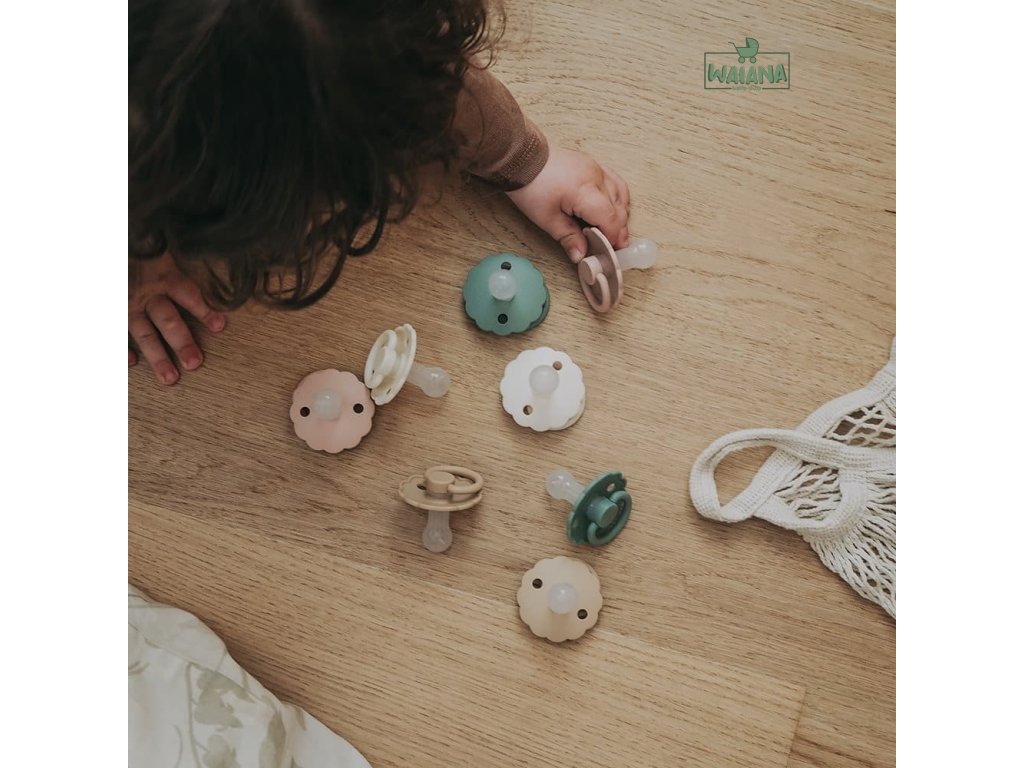 Dvojbalenie silikónových cumlíkov, vhodných pre deti od 6 mesiacov, so vzorom kvietka.