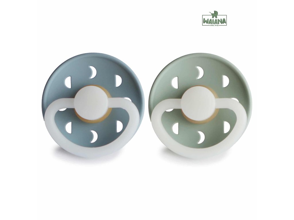 Dvojbalenie kaučukových cumlíkov vhodných pre deti od 6 mesiacov, svietiacich v tme, so vzorom mesiacov.
