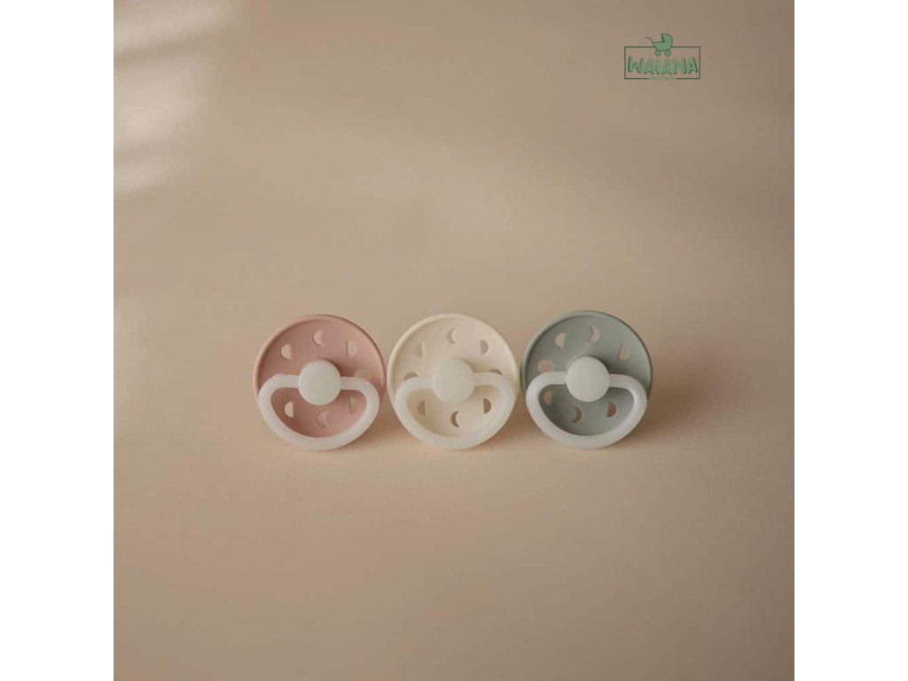 Dvojbalenie kaučukových cumlíkov vhodných pre deti od 6 mesiacov, svietiacich v tme, so vzorom mesiacov.