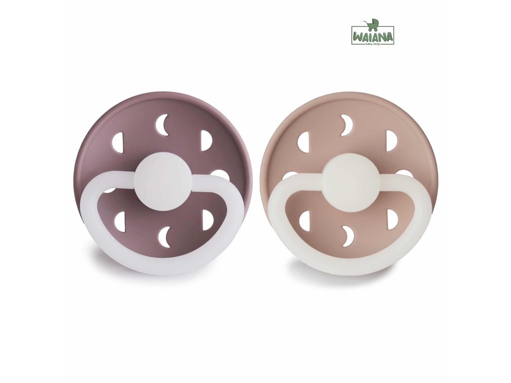 Dvojbalenie silikónových cumlíkov, vhodných pre deti od 0-6 mesiacov, svietiacich v tme, so vzorom mesiacov.