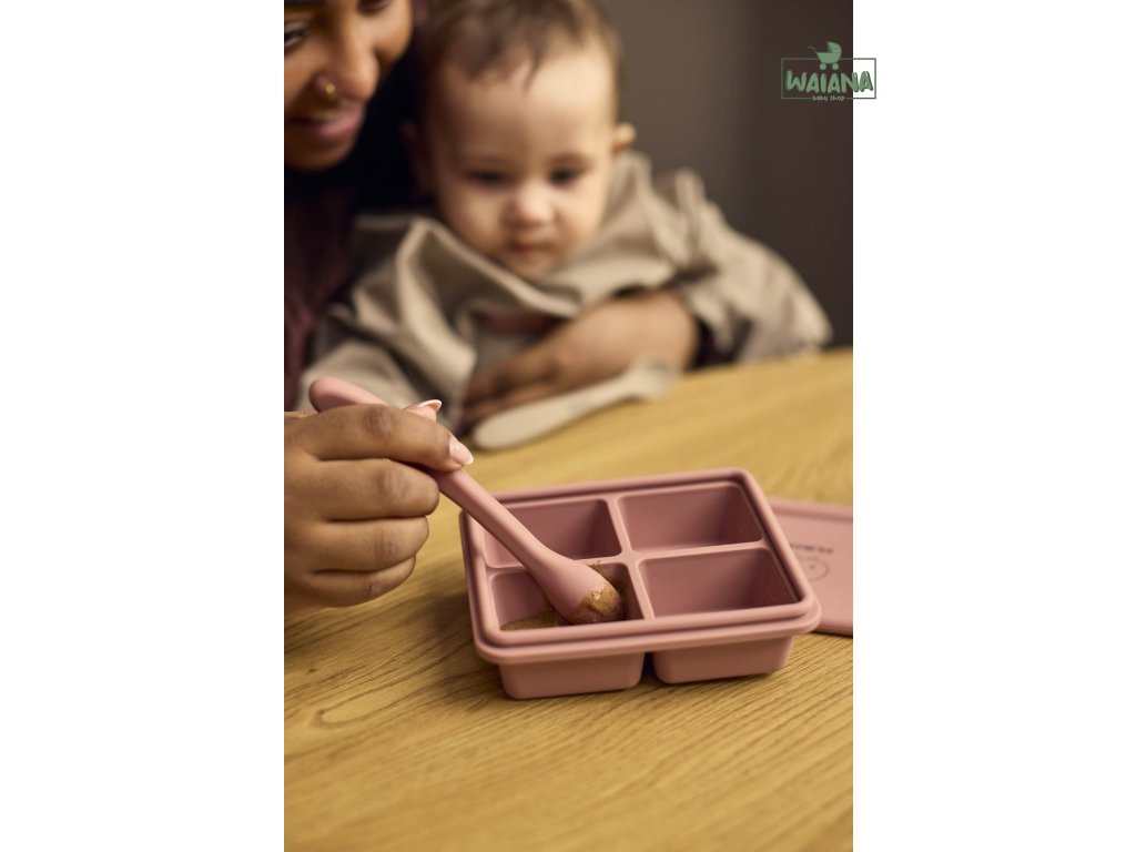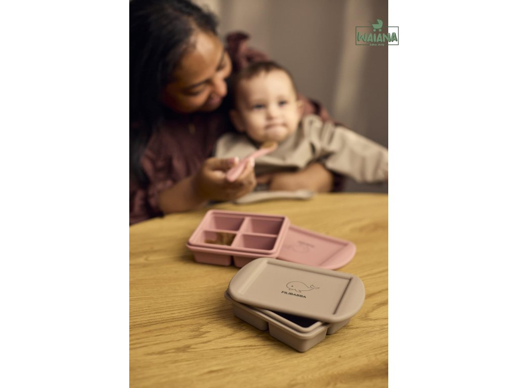 Každá miska má štyri priehradky s celkovým objemom 270 ml a je vybavená vzduchotesným vekom, ktoré udrží jedlo čerstvé. Vďaka pružnému silikónovému materiálu sa zmrazené porcie ľahko vyberajú, zatiaľ čo odolné prevedenie je ideálne na každodenné používanie. Vyrobené sú zo 100 % silikónu v potravinárskej kvalite s certifikátom LFGB. Misky sú bezpečné na používanie v mrazničke, mikrovlnnej rúre aj umývačke riadu (pred ohrevom alebo umývaním treba odstrániť veko).