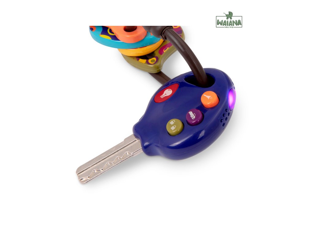Štyri kľúče ako od ozajstného auta na krúžku s príveskom. Jeden z kľúčov má ovládač s tromi rôznymi zvukmi a svetielkom. Odolný materiál bezpečný na skúmanie rúk i ústy.
