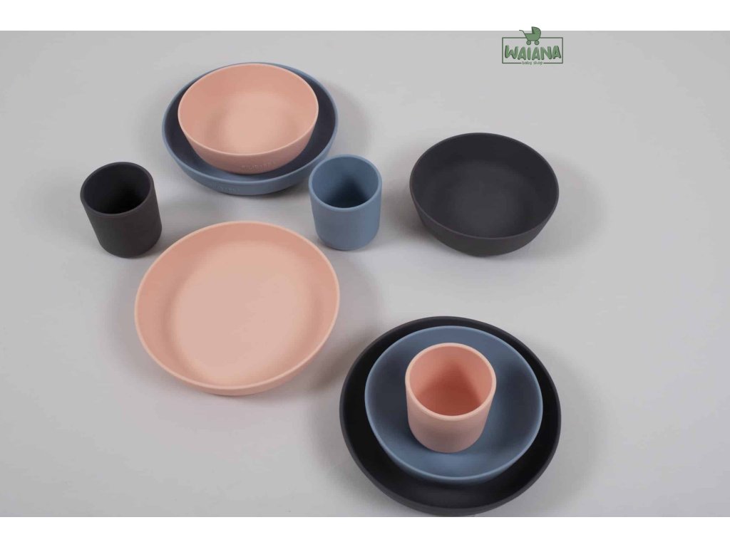 Mimoriadne jemná silikónová sada, ktorá sa skladá z pohára, misky a taniera, v jemnej púdrovo modrej farbe.