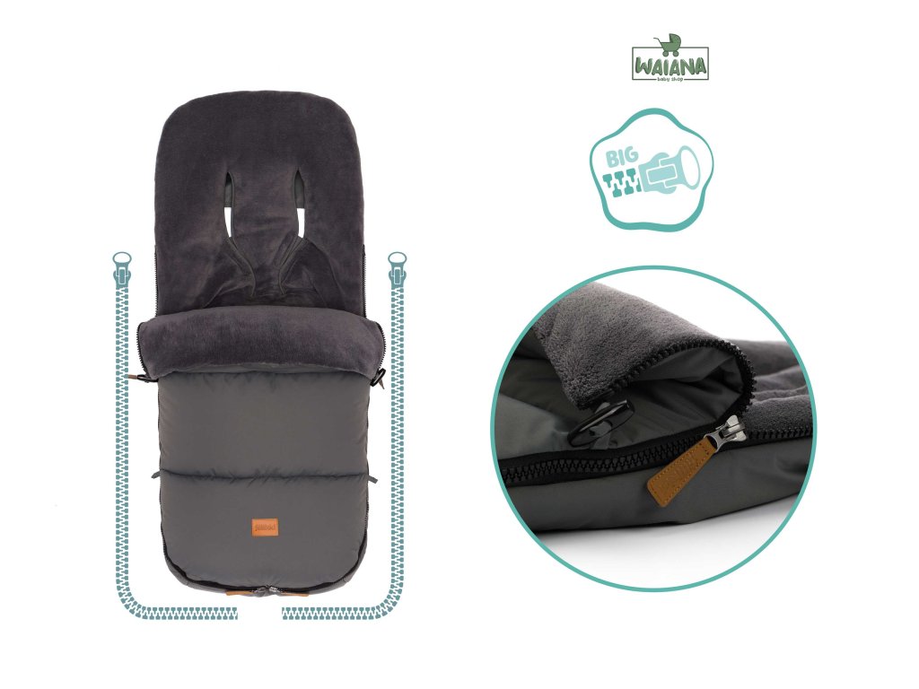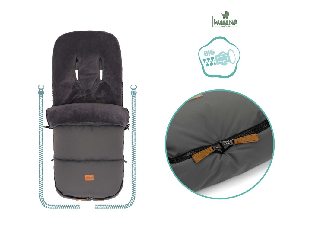 Díky celoobvodovému zipu je možné fusak částečně nebo zcela rozepnout. To umožňuje snadnější vkládání i vyjmutí dítěte z fusaku. Dva knoflíky po stranách umožňují sklopení přední části a vaše dítě je tak chráněno proti průvanu.