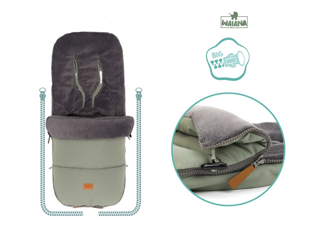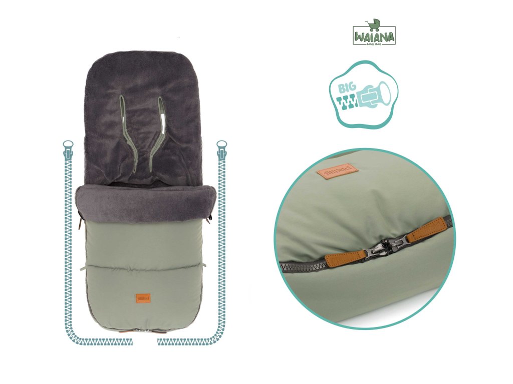 Díky celoobvodovému zipu je možné fusak částečně nebo zcela rozepnout. To umožňuje snadnější vkládání i vyjmutí dítěte z fusaku. Dva knoflíky po stranách umožňují sklopení přední části a vaše dítě je tak chráněno proti průvanu.
