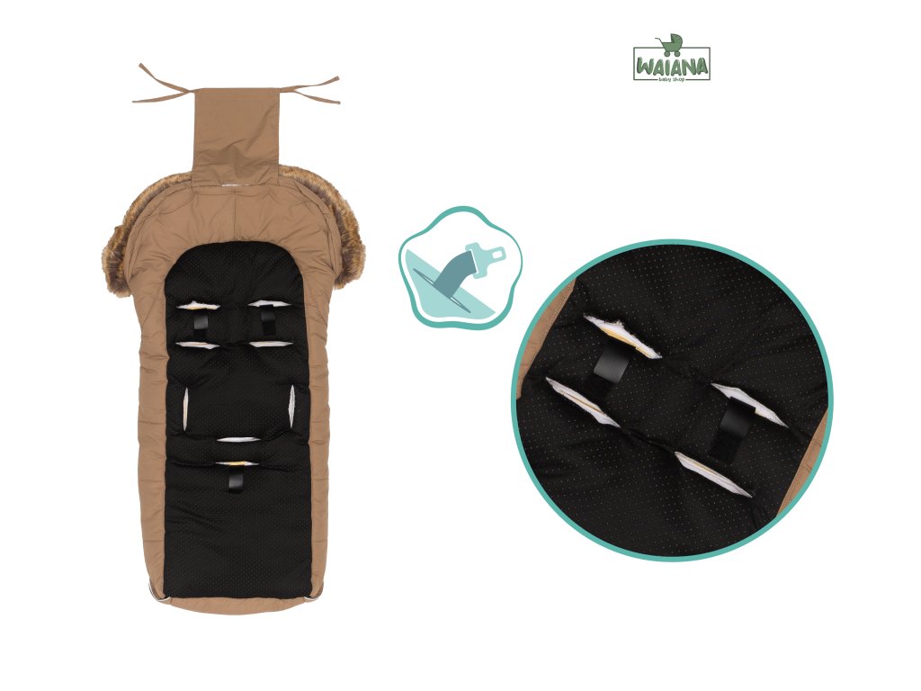 Praktické otvory na pásek umožňují fusak bezpečně uchytit v autosedačce nebo v kočárku.