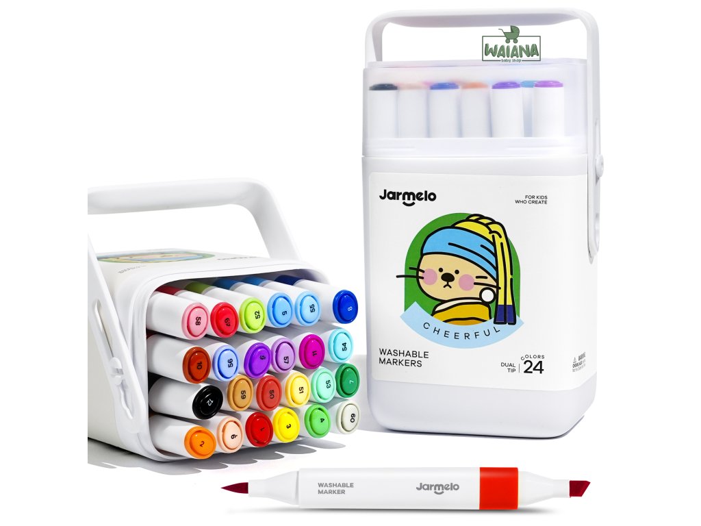 Fixky s dvoma hrotmi v prenosnom boxe 24 ksDvojitá dávka farieb pre malé i veľké umelecké výtvory v šikovnom baleníJar Melo obojstranné fixky prinášajú kombináciu jemného štetca a šikmého hrotu pre maximálne kreatívne možnosti. 24 žiarivých odtieňov umožní deťom i starším tvorcom nakresliť tie najkrajšie príbehy. Navyše si ich môžu so sebou vziať kamkoľvek vďaka praktickému boxu.Čo robí tieto fixky výnimočnými?Dve možnosti v jednej fixke – jeden časť v tvare jemného štetca a druhá so šikmým hrotomFixky sú washable – ľahko sa čistí z rúk, stola či oblečenia Ergonomický tvar tela – pohodlne padnú do malých rukúUložené v šikovnom balení - skvelé doma ja na cestyBezpečné, netoxické, určené pre deti od 3 rokov (vhodné aj pre školákov)Pevný uzáver, ktorý fixky udrží dlhodobo mokré a pripravené na ďalšie dobrodružstvo