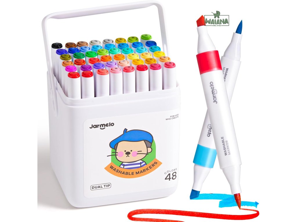 Fixky s dvoma hrotmi v prenosnom boxe 48 ksDvojitá dávka farieb pre malé i veľké umelecké výtvory v šikovnom baleníJar Melo obojstranné fixky prinášajú kombináciu jemného štetca a šikmého hrotu pre maximálne kreatívne možnosti. 48 žiarivých odtieňov umožní deťom i starším tvorcom nakresliť tie najkrajšie príbehy. Navyše si ich môžu so sebou vziať kamkoľvek vďaka praktickému boxu.Čo robí tieto fixky výnimočnými?Dve možnosti v jednej fixke – jedna časť v tvare jemného štetca a druhá so šikmým hrotomFixky sú umývateľné – ľahko sa čistia z rúk, stola či oblečenia Ergonomický tvar tela – pohodlne padnú do malých rúkUložené v šikovnom balení - skvelé doma aj na cestyBezpečné, netoxické, určené pre deti od 3 rokov (vhodné aj pre školákov)Pevný uzáver, ktorý fixky udrží dlhodobo mokré a pripravené na ďalšie dobrodružstvo