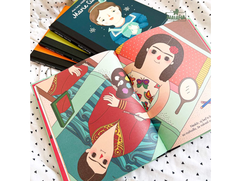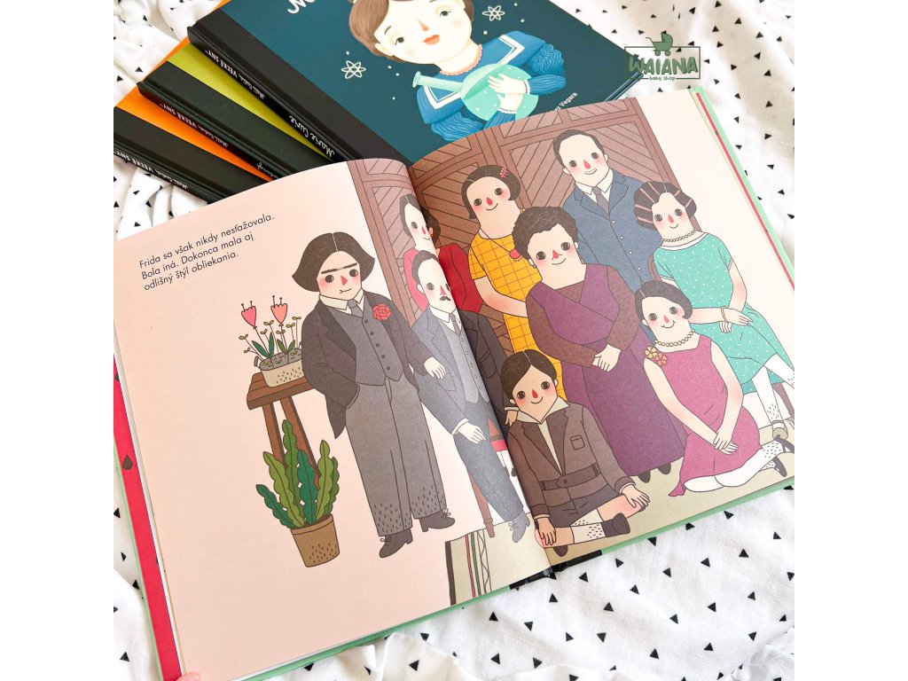 Frida Kahlo - Malí ľudia, veľké snyNahliadni do života slávnej umelkyne Fridy Kahlo.Frida Kahlo prežila v mladosti hrozivú nehodu autobusu, ktorá ju poznačila na celý život. Nemohla chodiť a tak začala v posteli maľovať. Jej autoportréty zobrazovali bolesť a zúfalstvo, ale aj životnú vášeň a intuíciu, ktoré ju poháňali vpred. Vďaka svojim obrazom sa stala najznámejšou umelkyňou 20. storočia.Na konci knihy nájdeš skutočné fotografie Fridy a fakty z jej života.Zoznám sa s výnimočnými ľuďmi a ich nevšednými osudmi. Či už ide o dizajnérov, umelcov či vedcov, všetci dosiahli úžasné úspechy, hoci na začiatku bol každý z nich len malé dieťa s veľkými snami.