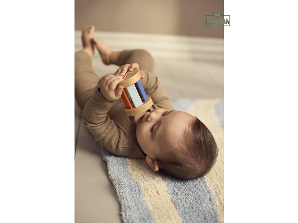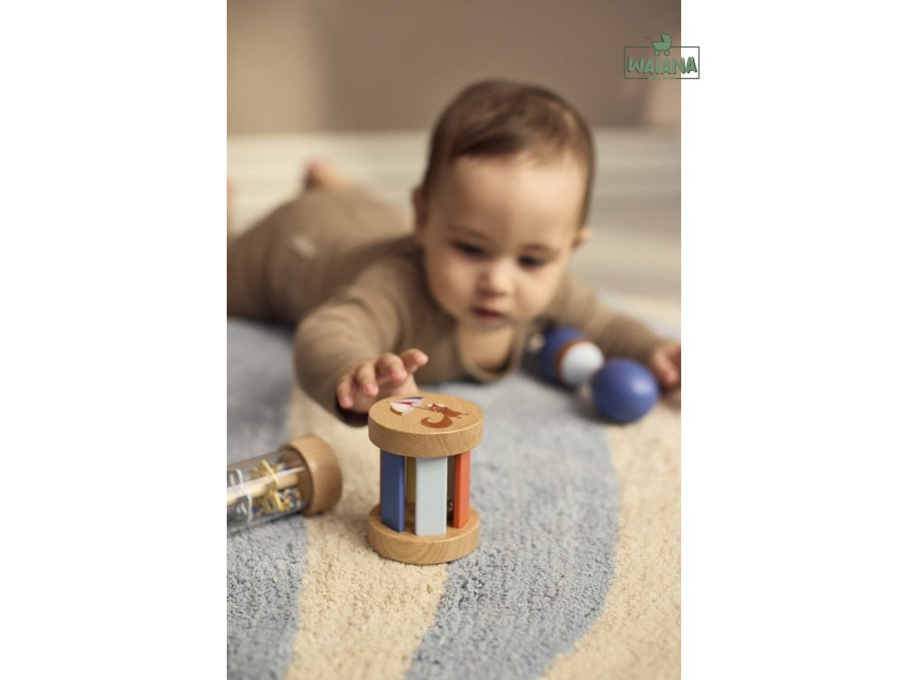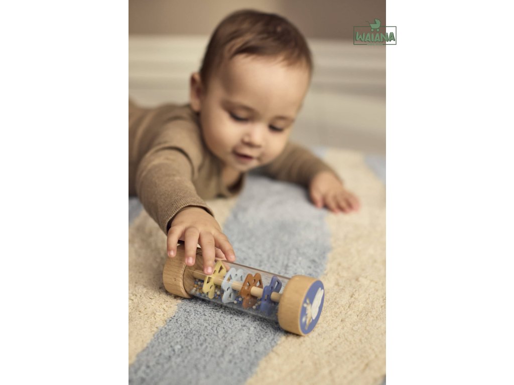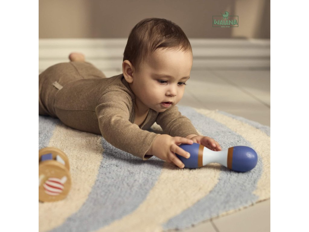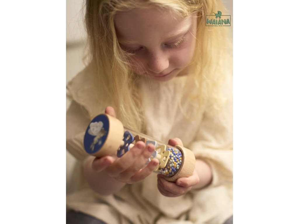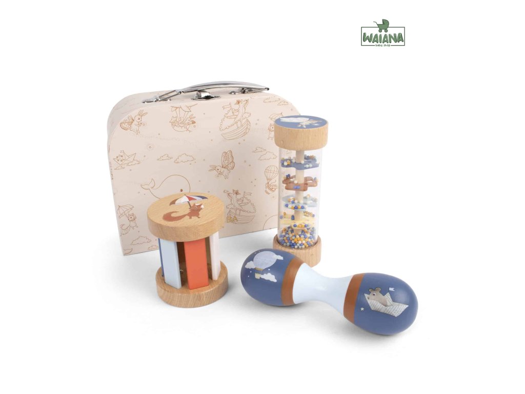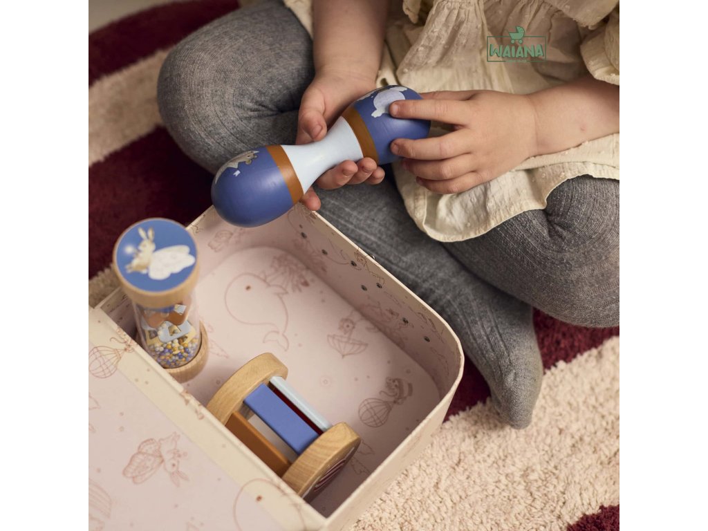 - Obsahuje 3 senzorické hračky: dvojitú maraku, drevenú hrkálku s rolničkou a hrkálku typu „rainmaker“.