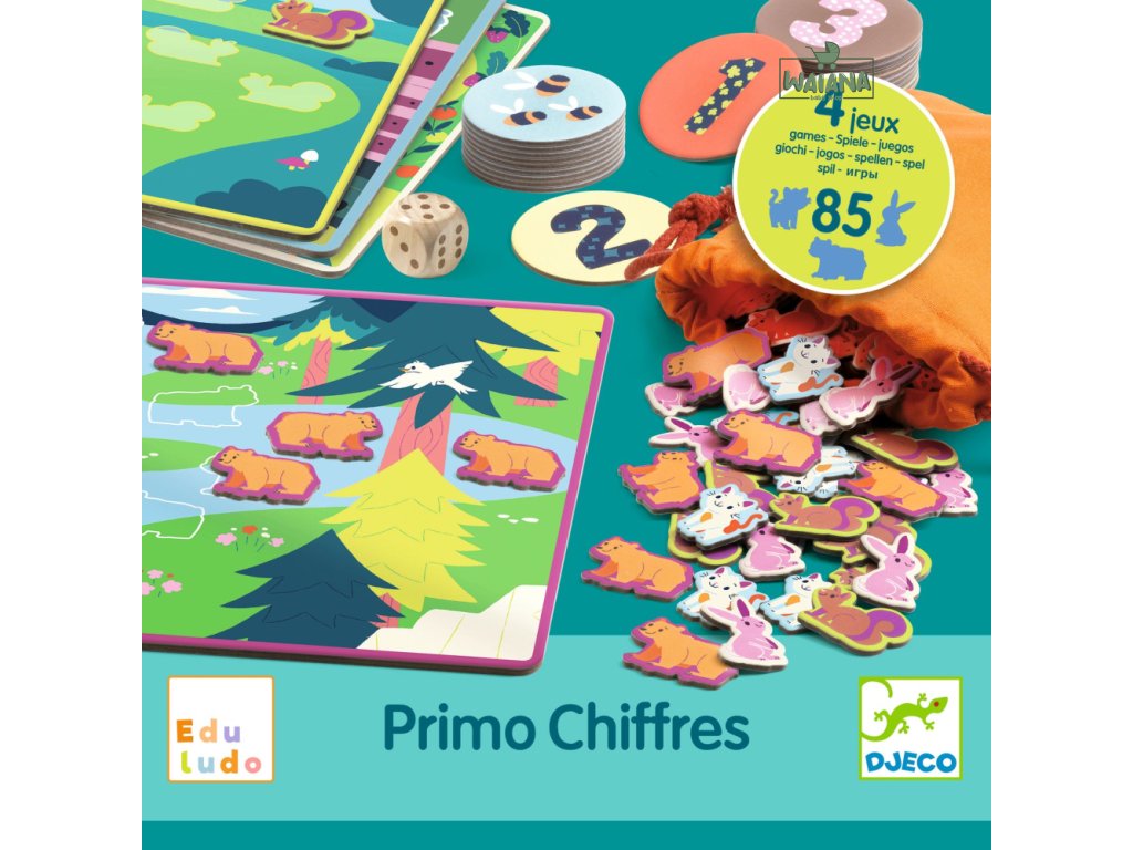 Sada Eduludo: 4 hry s číslami (Primo Numbers) od DJECO ponúka štyri vzdelávacie hry s narastajúcou úrovňou obťažnosti. Deti od 3 rokov sa môžu učiť, rozpoznávať a hrať sa s číslami interaktívnym a hravým spôsobom. Pozorujte, trieďte a usporadúvajte a spoznávajte základné pojmy množstva, počítania a párovania – to všetko s rozkošnými zvieratkami! Táto sada je nevyhnutná učebná pomôcka pre deti, ktoré sa učia základom matematiky hravou formou.
