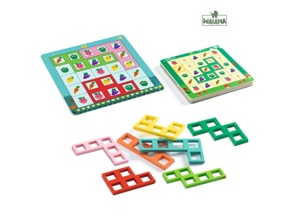 Hra Logická záhradaDokážeš správne rozdeliť ovocie a zeleninu do záhonov?Vitaj v logickej záhradke plnej chutného ovocia a zeleniny! Na prvý pohľad to vyzerá jednoducho – plody stačí rozdeliť do záhonov. Má to však jeden háčik: v každom záhone môže byť iba jeden druh ovocia alebo zeleniny, a navyše musíš dodržať presné tvary záhonov, ktoré určuje zadanie. Hra Logická záhrada obsahuje 40 ilustrovaných úloh rôznych úrovní náročnosti. Každá úloha predstavuje inú výzvu pre malých záhradníkov a logikov. Úlohou dieťaťa je vybrať zo 7 drevených dielikov práve tých 5, ktoré presne zapadnú do mriežky a vytvoria správne oddelené záhony – bez presahovania a bez miešania plodov.Hlavolam, ktorý zabaví aj naučíHra je určená pre jedného hráča a podporuje:
