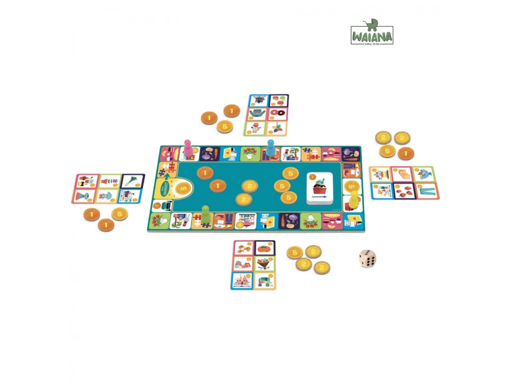 Nakúpte veci podľa nákupného zoznamu ako prvý! Nákupná spoločenská stolová hra, v ktorej je cieľom ako prvý nakúpiť veci podľa nákupného zoznamu. Každý hráč má svoj nákupný zoznam a k dispozícii 15 eur.Deti sa zábavným spôsobom naučia ako nakupovať na trhu Okrem kupovania vecí zo zoznamu si hráč môže ťahať akciové karty, vďaka ktorým získa peniaze z banky, zľavový kupón (použiteľný pri nákupe), bezplatný lístok na niektorú aktivitu, alebo pre ktoré musí vynechať ťah či stratí nákupnú tašku. Obsah: herný plán, 4 figúrky, 4 nákupné zoznamy, kocka, 26 kariet „akcia“, 32 žetónov „peniaze“, 24 žetónov „nákupná taška“Počet hráčov: 2 – 4Trvanie hry: 10 min.