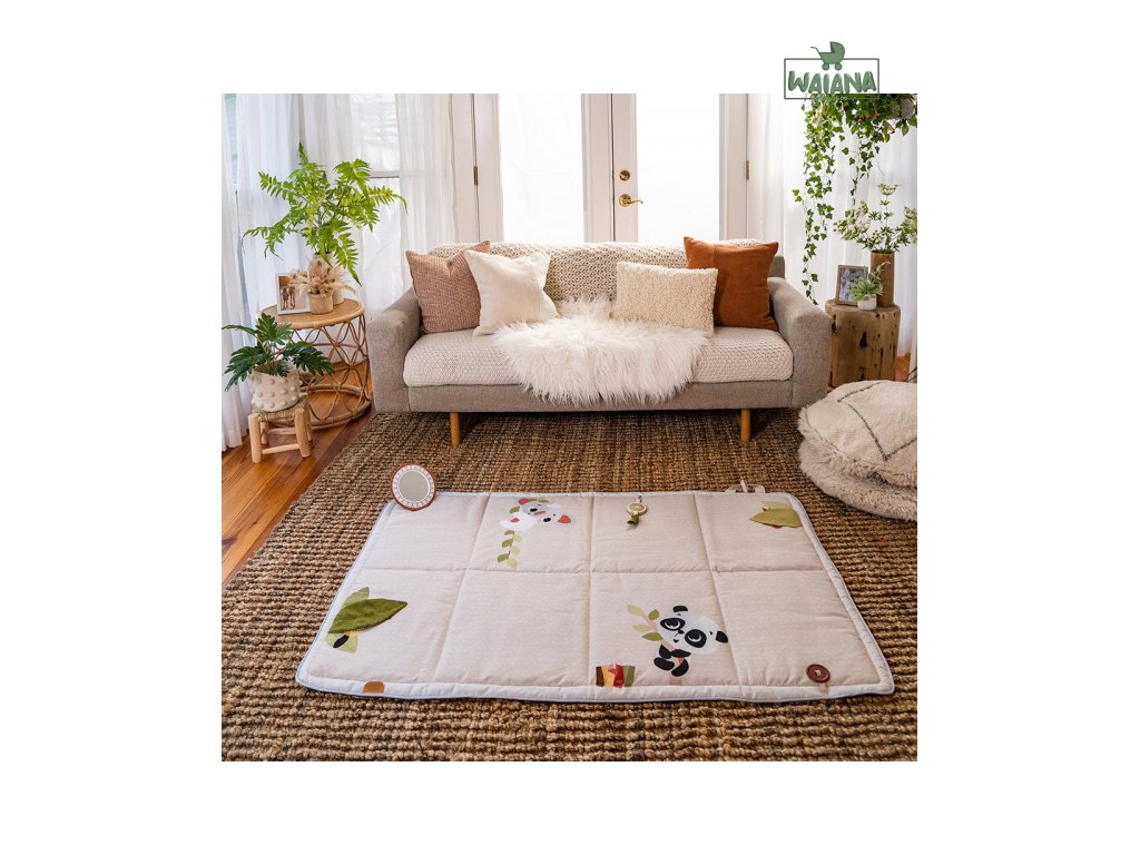 Extra veľká, mäkká hracia deka s krásnymi ilustráciami koaly a pandy ponúka množstvo aktivít na zabavenie dieťaťa a rozvíjanie jeho zmyslov a motorických zručností: bezpečné zrkadlo, oddeliteľnú drevenú hrkálku, farebné stužky i šuštiace časti.