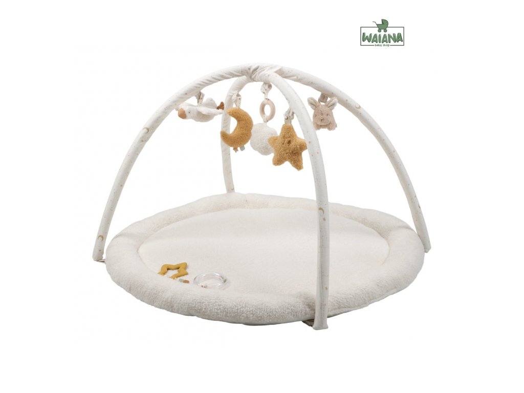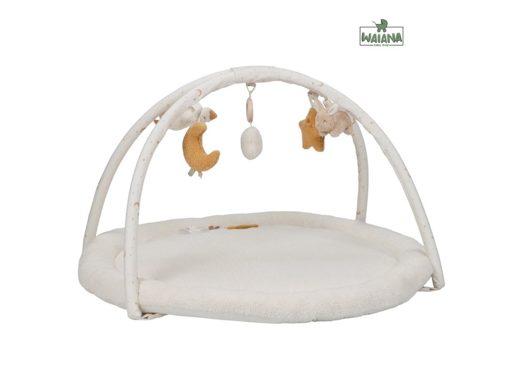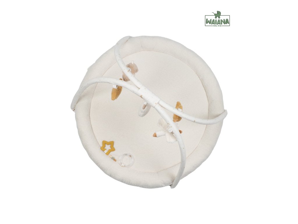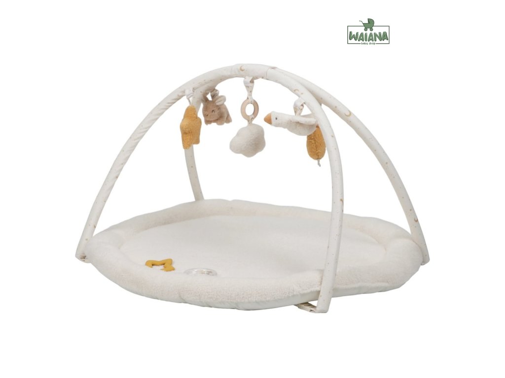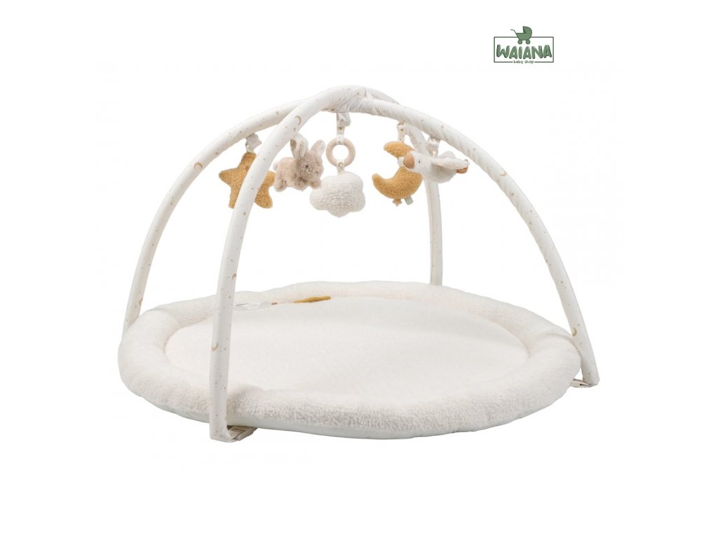 Mäkká hracia deka s hrazdou, na ktorej sú zavesené hračky v podobe králika, husi, mesiaca, hviezdičky a mráčika. Pri skúmaní hračiek upúta pozornosť dieťaťa hrkanie, šušťanie, pískanie i zvonenie. Hračky sú odnímateľné a je možné ich používať aj samostatne.