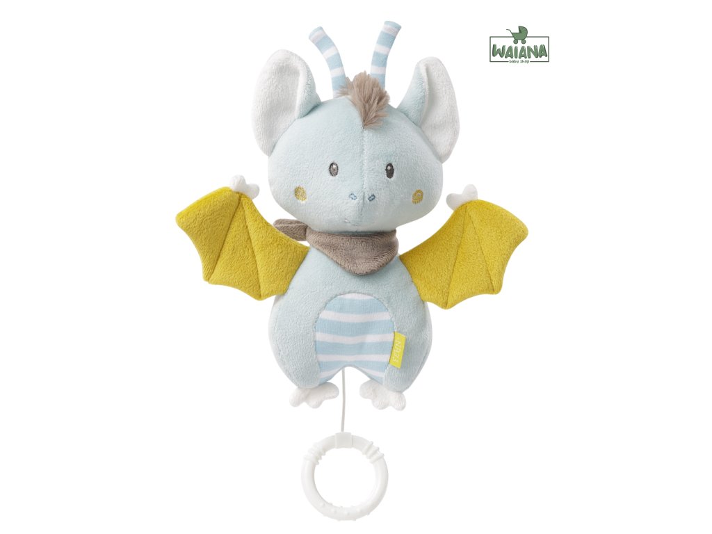 Malý hudobný box v tvare netopiera s vyberateľným hudobným mechanizmom. Hračka je vyrobená z mäkkých, príjemných materiálov, ktoré nabádajú k dotyku a maznanie. Netopier má na chrbte zips, ktorým môžete vybrať hrací strojček. V spodnej časti hračky je šnúrka s krúžkom, ktorý sa ľahko ovláda. Zatiahnutím spustíte uspávanku. Netopier sa dá ľahko pripevniť pomocou viazacích šnúrok.