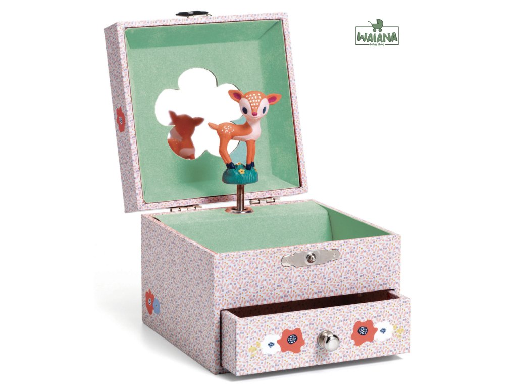 Hracia skrinka Srnka Hracia skrinka s milučkou figúrkou srnčaťa vo vnútri. Natiahnutím skrutky a otvorením veka sa spustí melódia Čarovná flauta (W. A. Mozart) a roztočí sa figúrka. Figúrka sa zrkadlí v zrkadielku na vnútornej strane veka. Do priečinka a spodnej zásuvky si môžeš odložiť pokladíky alebo šperky.Skrutka na natiahnutie mechanizmu je na zadnej strane skrinky. Mechanizmus sa zastaví po určitej dobe alebo ho prerušíš zatvorením veka. Vnútro skrinky je potiahnuté mäkkým zamatom. Skrinka je drevená, polepená papierom s jemným kvetovým vzorom a milučkou ilustráciou srnčaťa.Trvanie melódie: cca. 2,5 min.Odporúčaný vek: 4+ rokovRozmery: 10,5 x 10,5 x 8,5 cmRozmery balenia: 11 x 12 x 9 cm