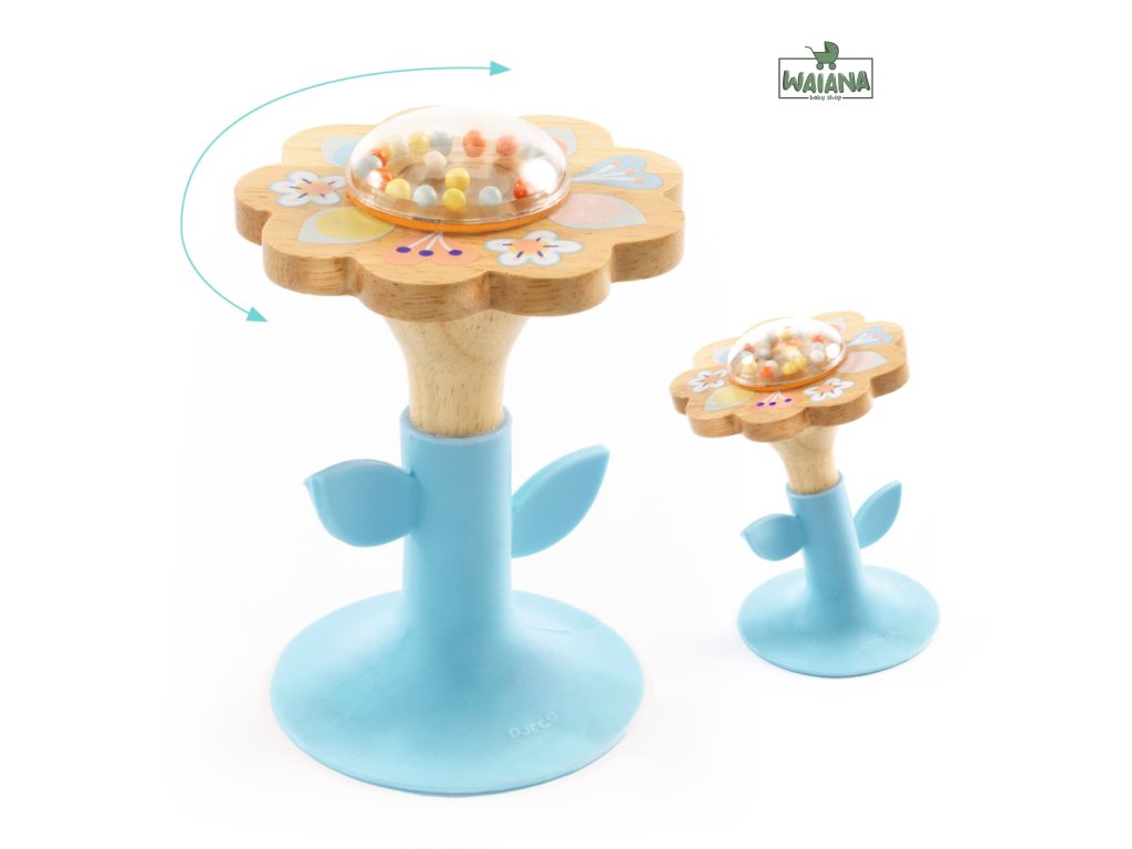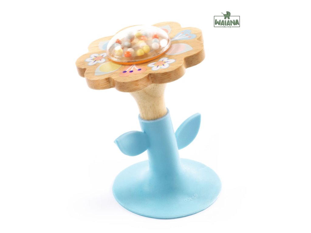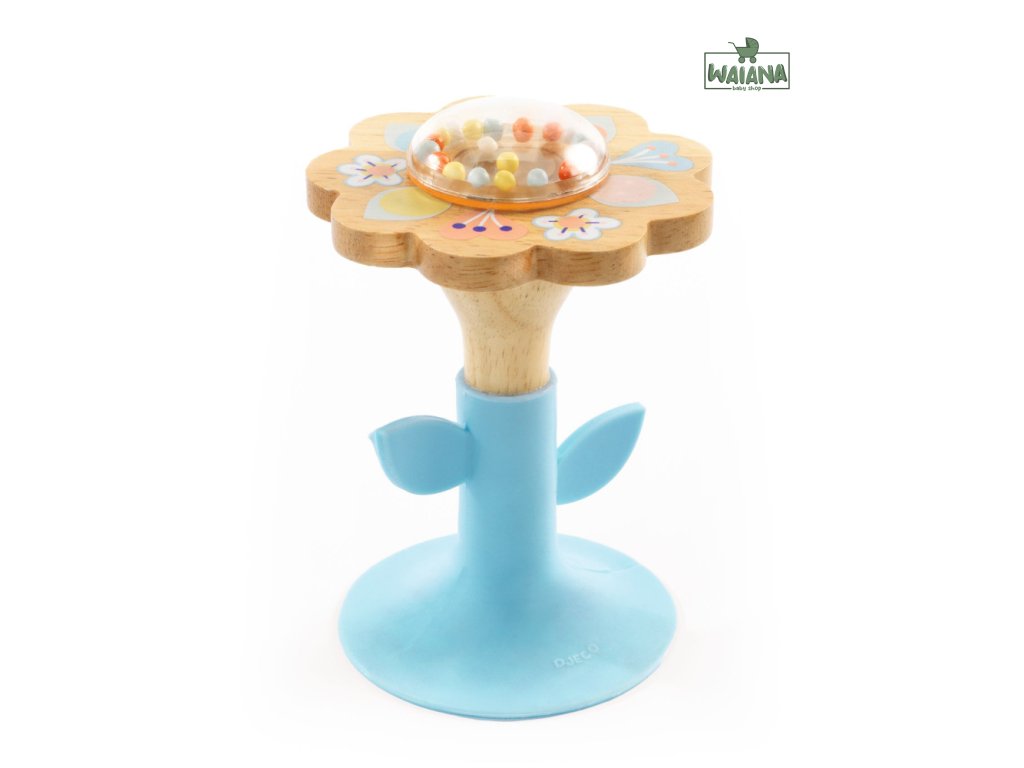 Hrkálka Kvietok BabySwip Hrkálka v tvare kvetinky Mäkká stonka, kvetina z prírodného dreva a priesvitný stred plný farebných malých korálikov. Vďaka prísavke si vaše dieťa môže užívať klepanie na kvetinu bez toho, aby sa prevrhla.