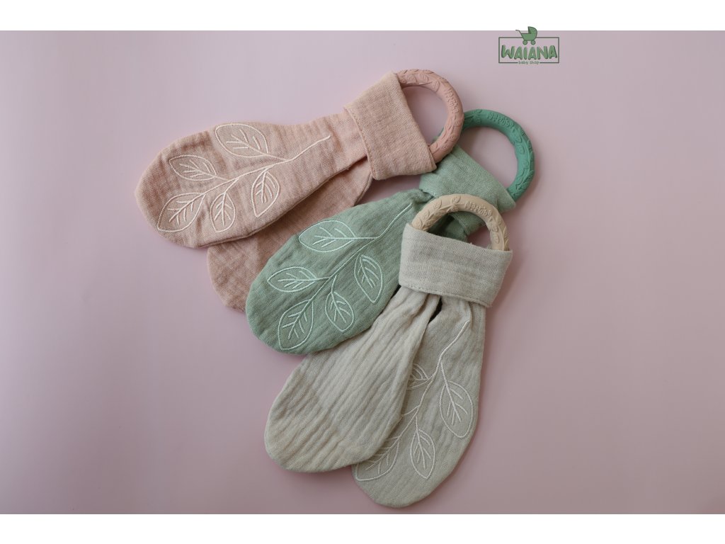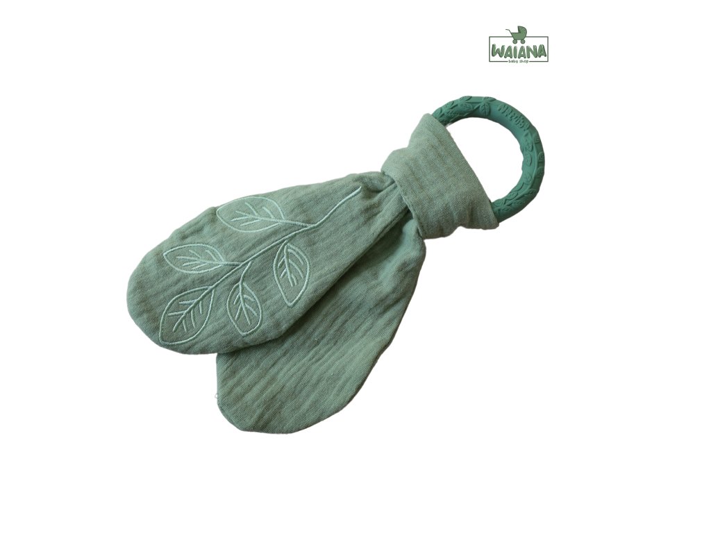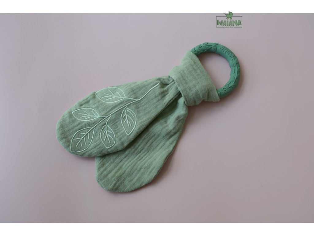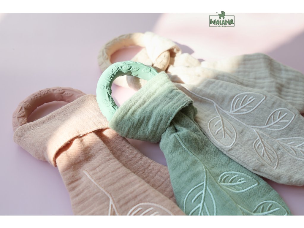 Hryzátko Mušelínové ZelenéRoztomilá, krásna a praktická hračka 3 v 1S našou hračkou na hryzenie s aktivitami získa vaše dieťa šidítko, hryzátko aj hračku na rozvoj všetkých zmyslov! Vyrobené zo zelenej jemnej organickej mušelínovej bavlny a prírodného kaučuku s krčeným papierom vo vnútri jedného z listov na stimuláciu zmyslu pre sluch. Krúžok z prírodného kaučuku stimuluje hmat vďaka krásnej textúre so vzorom listov, chuťový zmysel aj čuch, keďže prírodný kaučuk má vôňu prírodného kaučuku. Jeden z mušelínových listov má na mušelíne vyšívaný vzor listov, ktorý stimuluje zmysel pre zrak, a všetky tieto aktivity spolu stimulujú koordináciu oko-ruka a jemnú motoriku.Aktivuje zvedavosť vášho dieťaťaDruhý mušelínový list je bez vzoru a pokrčeného papiera, len z mäkkého organického mušelínu, ktorý poteší vaše dieťatko. Okrem toho mäkký a pružný krúžok z prírodného kaučuku so vzorom listu upokojí vaše dieťatko a pomôže boľavým ďasnám. Krúžok z prírodnej gumy a mušelín sa dajú od seba ľahko oddeliť.Testované a certifikované na použitie od 0+ mesiacov.Rozmery:Krúžok z prírodného kaučuku: Ø7Šidlo: V: 8 cm x D: 20 cm.Kombinované: D: 25 cm
