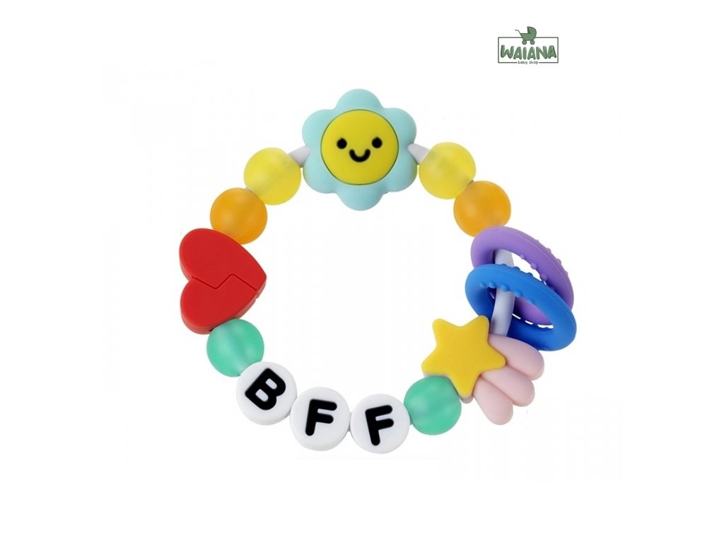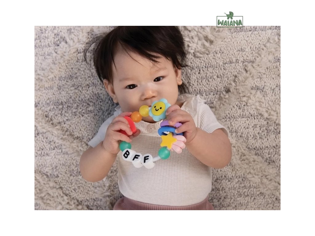 Krásné kousátko v podobě náramku je vyrobeno z pružného měkkého silikonu. Různorodé textury lákají dítě ke zkoumání v ústech, masírováním dásní kousátko pomáhá dítěti při prořezávání prvních zoubků.