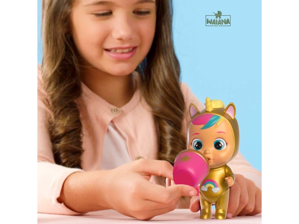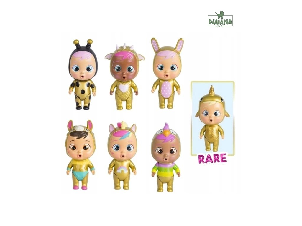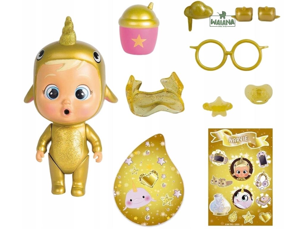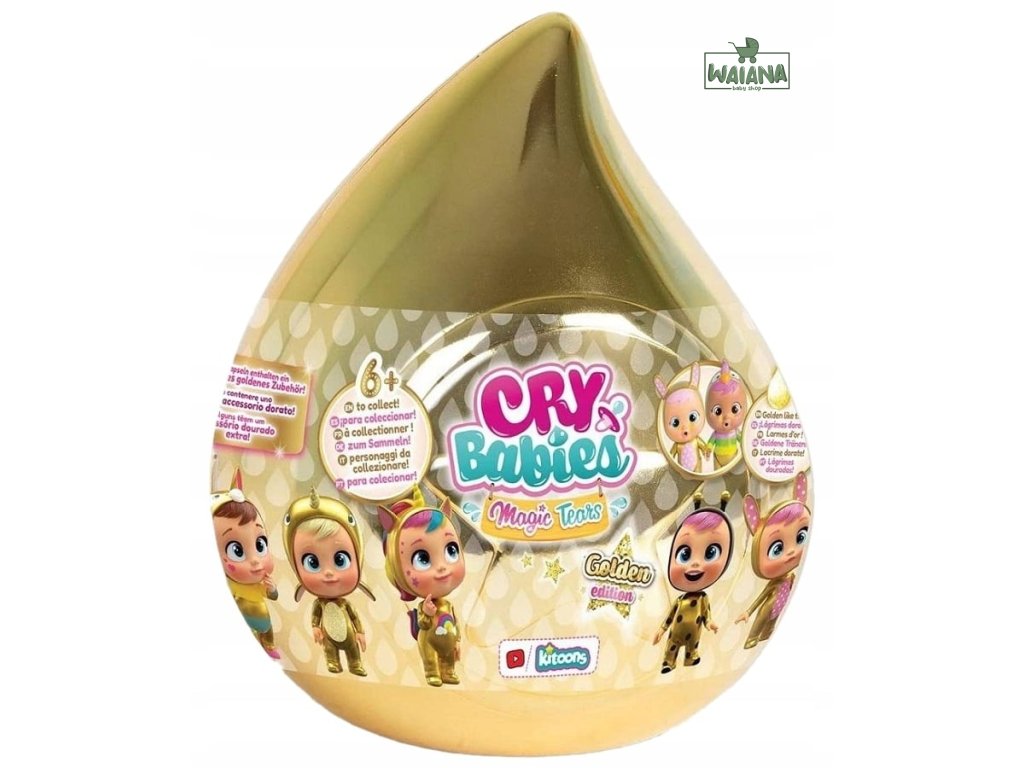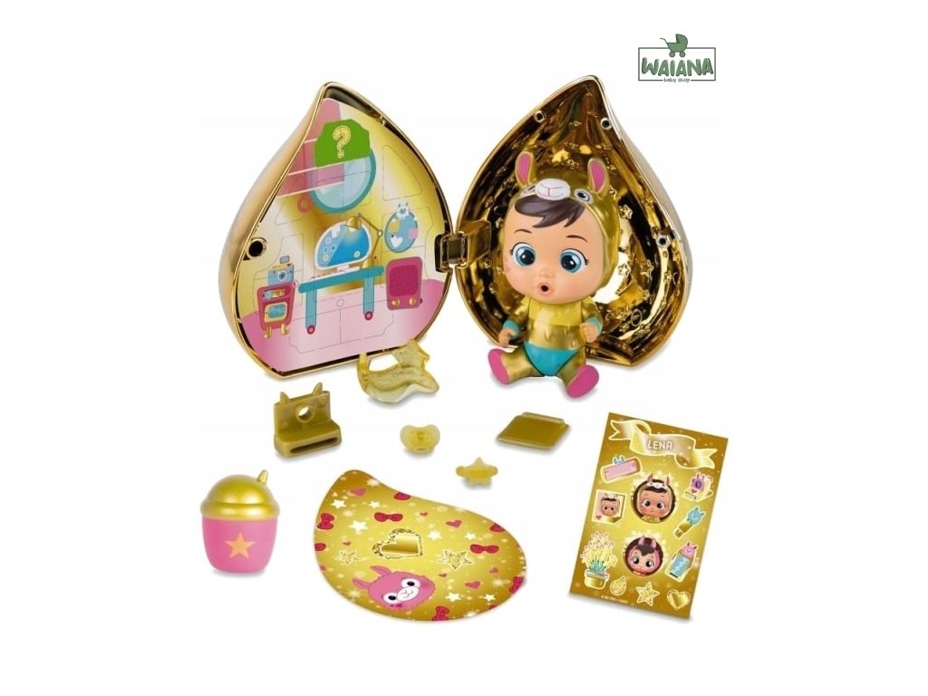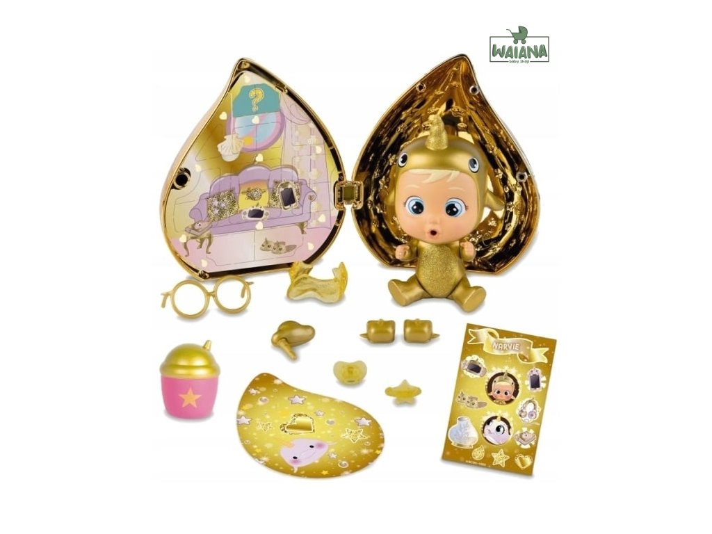 - 1 bábika Cry Babies Magic Tears (Golden Edition)- Zlaté doplnky (napr. fľaša, cumlík, stolička)- Prekvapujúce prvky alebo ďalšie doplnky- Zlatý kufrík