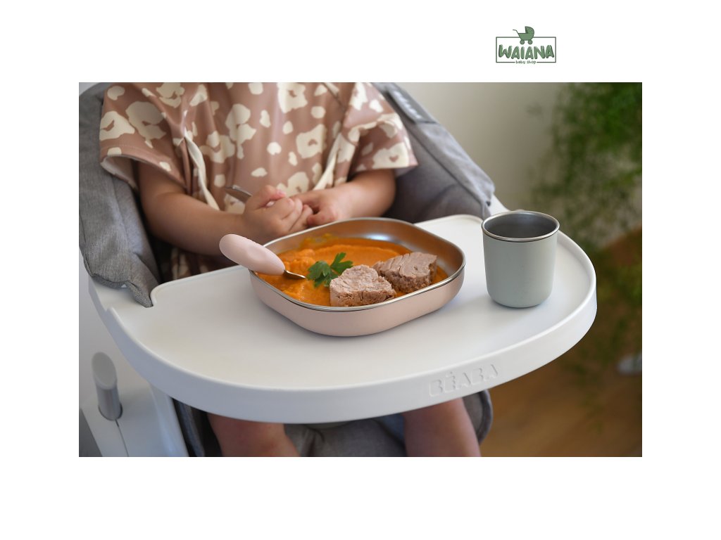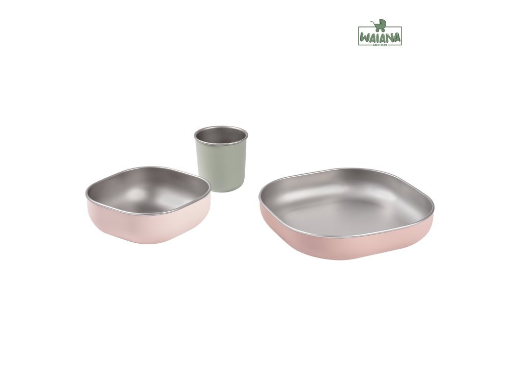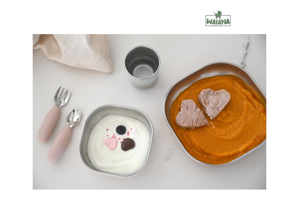 Jídelní sadu inovativního nerezového nádobí se silikonovou povrchovou vrstvou tvoří talíř, miska a kelímek. Ergonomický tvar s vysokými stranami a zaoblenými rohy jsou ideální pro učení dětí samostatnému stolování. Silikonový povrch nádobí pomáhá, aby nádobí neklouzalo na stole ani v ruce.