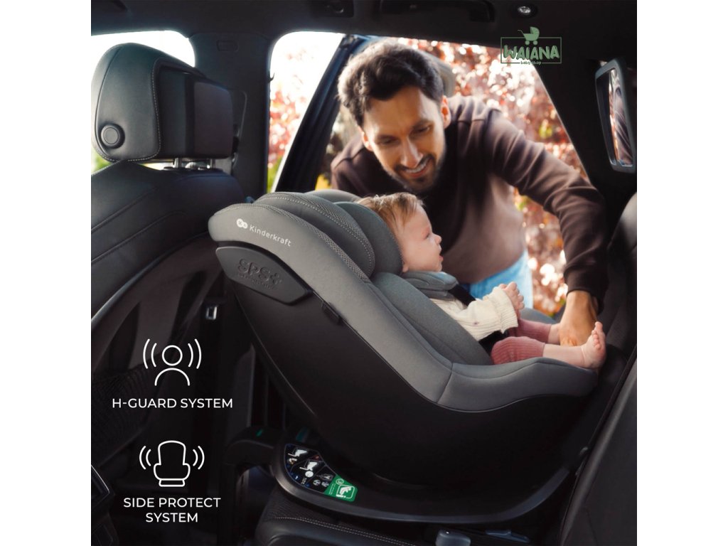 Sedačka obsahuje špeciálne bezpečnostné systémy, ako H-GUARD SYSTEM a SIDE PROTECT SYSTEM, ktoré absorbujú energiu pri náraze a chránia citlivé časti tela – hlavu, krčnú chrbticu a panvu. Mäkké, priedušné materiály nedráždia detskú pokožku a široké, hlboké sedadlo spolu s ventilovanou škrupinou zabezpečujú pohodlie aj počas horúcich dní.