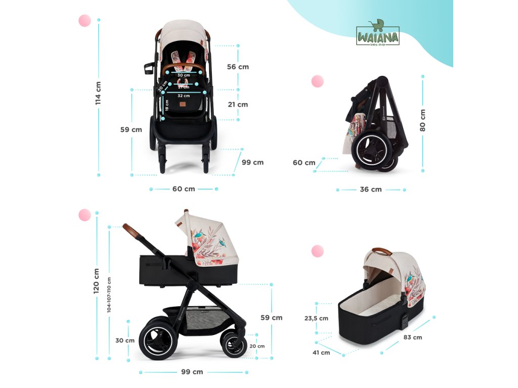 Rozmery kočíka s vaničkou: Výška: 120 cm (po hornú časť vrchlíka) x Šírka: 60 cm x Dĺžka: 99 cm