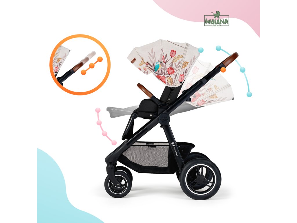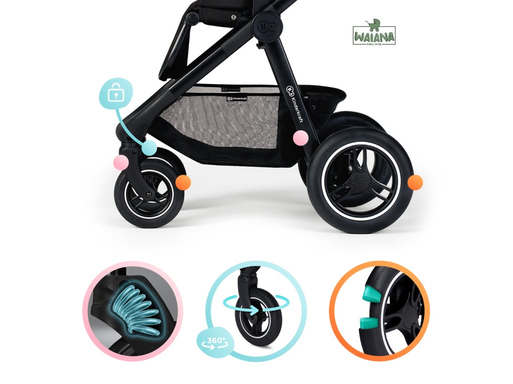 - kolesá sú odolné a poskytujú dobrú priľnavosť k podkladu, vďaka nim je jazda s kočíkom na mnohých povrchoch ľahká a príjemná a pohybovanie s kočíkom je jednoduché a bezproblémové.