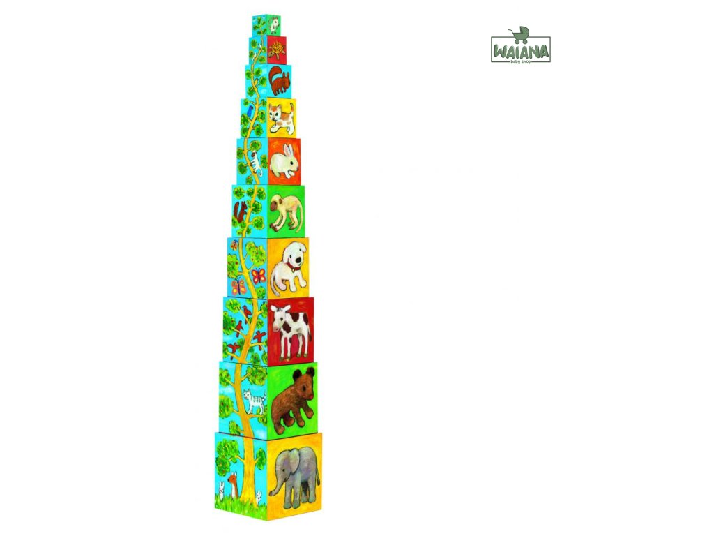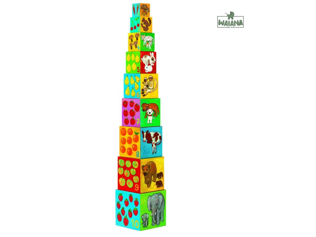 Ako vysokú vežu dokáže vaše dieťa postaviť? 10 krásnych farebných ilustrovaných kociek, ktoré sú vyrobené z veľmi kvalitného, pevného a vysoko odolného vytvrdeného kartónu pre najmenších s nádhernými farebnými obrázkami.Stavanie rozvíja koncentráciu a jemnú motoriku. Kocky sú veľmi pevné a ľahké. Na každej strane kocky je iný obrázok. Deti sa môžu kochať obrázkami samostatných zvieratiek, zvieratkami s mláďatkom, stromčekom, ktorý plynule prechádza kockami a obrázkami ovocia a zeleniny, ktoré pomáhajú s prvým počítaním.Výška veže: 87 cmNajväčšia kocka: 15 x 15 x 15 cm