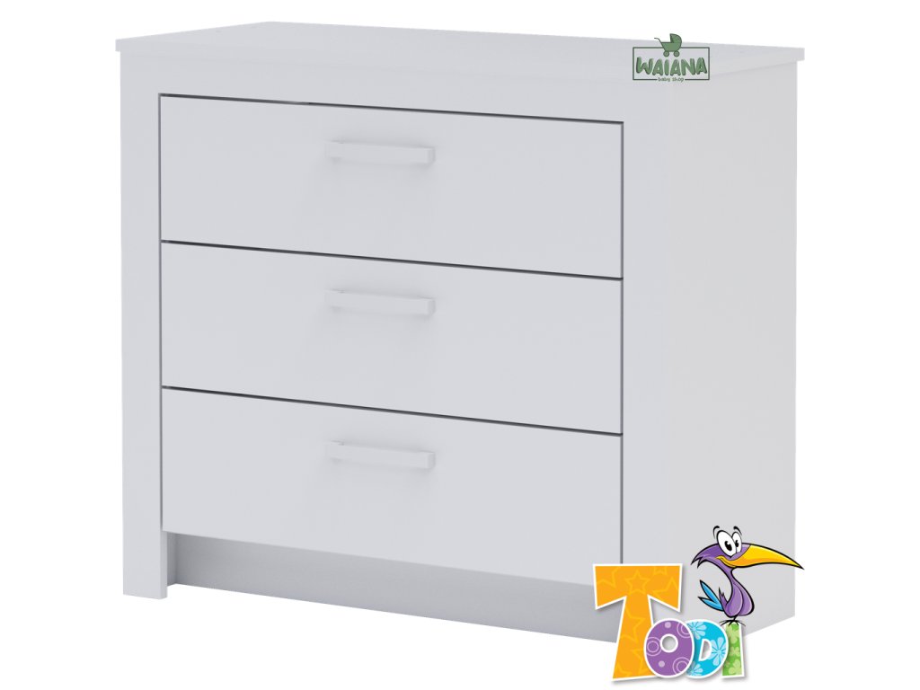 V troch 23 cm vysokých zásuvkách ponúka dostatok miesta pre oblečenie, plienky, kozmetiku a ďalšie potreby pre Vaše bábätko. K dispozícii je tiež prebaľovací nadstavec a otvorená polička pod prebaľovací nadstavec (viď súvisiaci tovar).