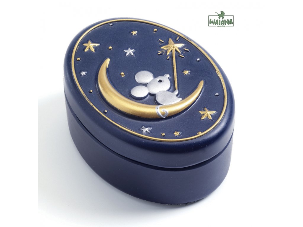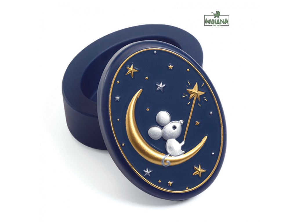 Krabička na zúbky Roztomilá bambusová dózička na mliečne zúbky. Motív myšky zdobiaci veko má reliéfnu úpravu a metalický lesk. Veko drží pevne vďaka silikónovému tesneniu.Uchovajte si prvé zúbky ako krásnu spomienku na vášho drobčeka. Keď vaše deti vyrastú, môžete si spomienky prezrieť spoločne. Svoje deti môžete dokonca zabaviť zábavnými príbehmi, ktoré súvisia s prerezávaním zúbkov. Je to aj skvelý darček od Zúbkovej víly. Dózička na vypadnuté mliečne zúbky má rozmery: 6 x 4,5 x 3 cm.