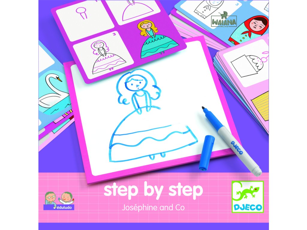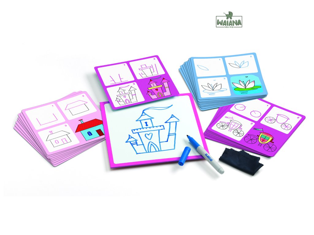 Krok za krokom – Princezné je zábavná edukačná sada z kolekcie Eduludo, ktorá deti učí kresliť princezné, kvety a ďalšie dievčenské motívy jednoduchým a zrozumiteľným spôsobom. Vďaka názorným predlohám sa dieťa učí kresliť krok za krokom, bez stresu a s radosťou z každého podareného obrázka. Kreslenie sa tak prirodzene mení na hru, ktorá rozvíja trpezlivosť, sústredenie a sebavedomie. Dieťa kreslí stierateľnou fixkou na tabuľku podľa predlohových kariet a hotový obrázok môže jednoducho zotrieť a skúšať znova, čo podporuje učenie bez obáv z chýb.
