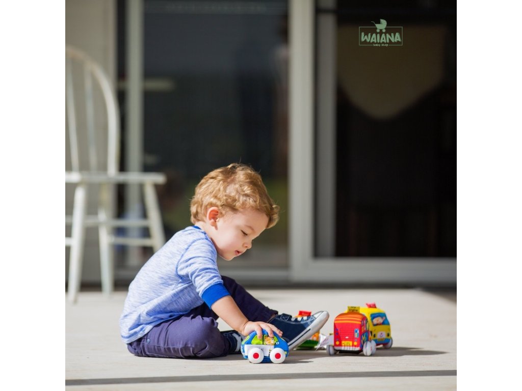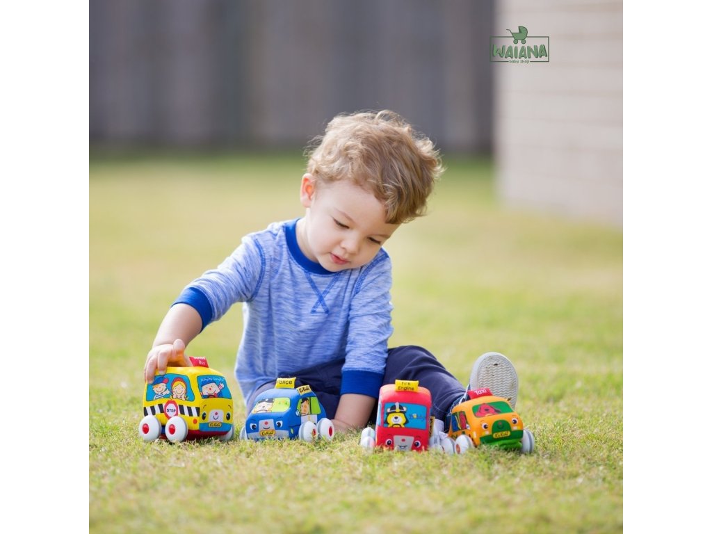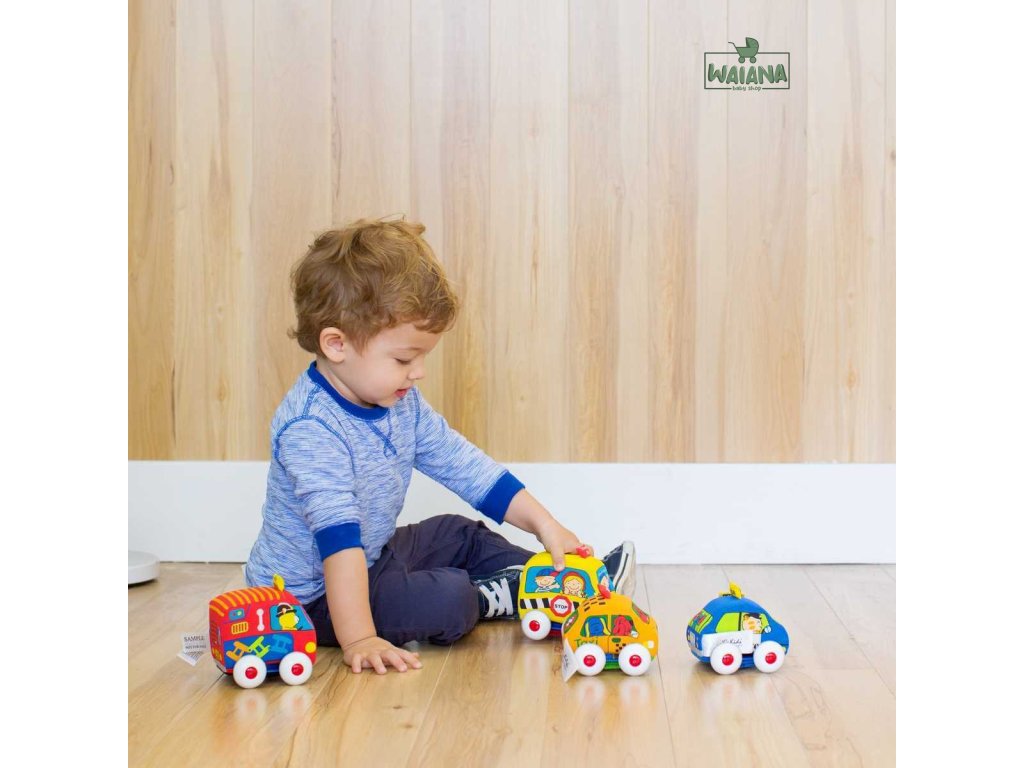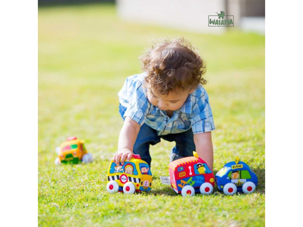 Účel: Stimulácia zmyslov. Metóda: Stimulujte hmat dieťaťa jemným vozením autíčka po tele dieťaťa. Cieľ: Cvičenie jemnej motoriky – úchop a tlak. Spôsob: Autíčka sú vyrobené z jemných materiálov. Povzbudzujte svoje dieťa, aby ich chytilo pravou aj ľavou rukou. Cieľ: Nácvik hrubej motoriky – plazenie. Spôsob: Uveďte auto do pohybu tak, aby ho dieťa pri plazení nasledovalo. Cieľ: Tréning malej a hrubej motoriky – tlačenie. Metóda: Povzbudzujte svoje dieťa, aby tlačilo autíčko po podlahe. Účel: Balančné cvičenie - stohovanie. Metóda: Povzbudzujte svoje dieťa, aby na seba postavilo až 2 autá. Toto cvičenie rozvíja trpezlivosť dieťaťa.