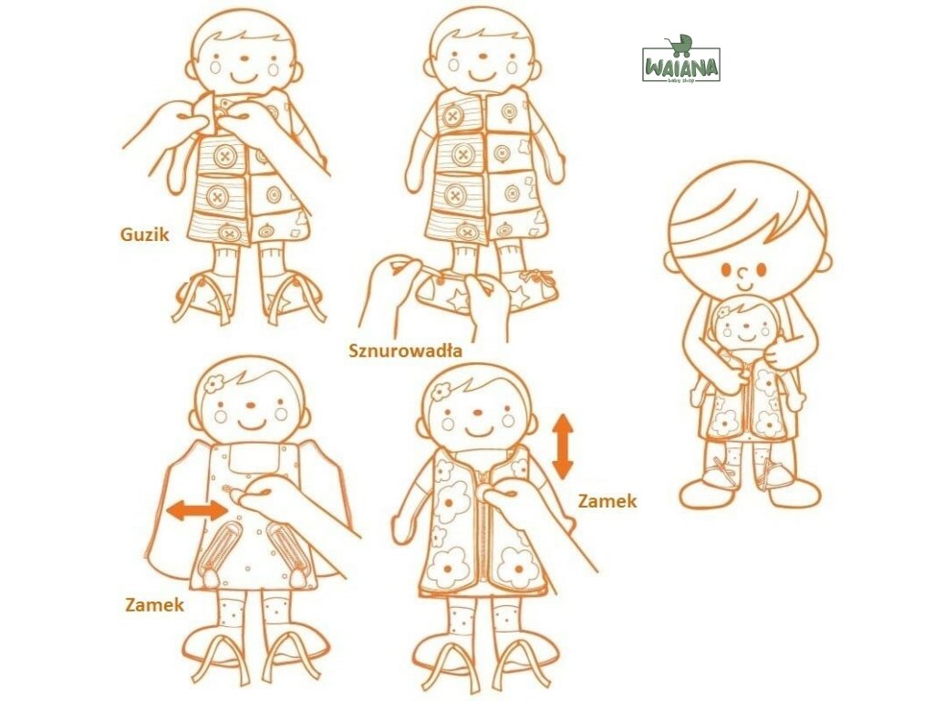 Deti si môžu precvičovať rôzne činnosti spojené s obliekaním, ako je zapínanie gombíkov (v dvoch veľkostiach), viazanie šnúrok, zapínanie zipsu a ďalšie úkony, ktoré sú zamerané na zdokonaľovanie jemných pohybov prstov. Tieto aktivity prispievajú k lepšej koordinácii oko-ruka a rozvoju presnosti pohybov.