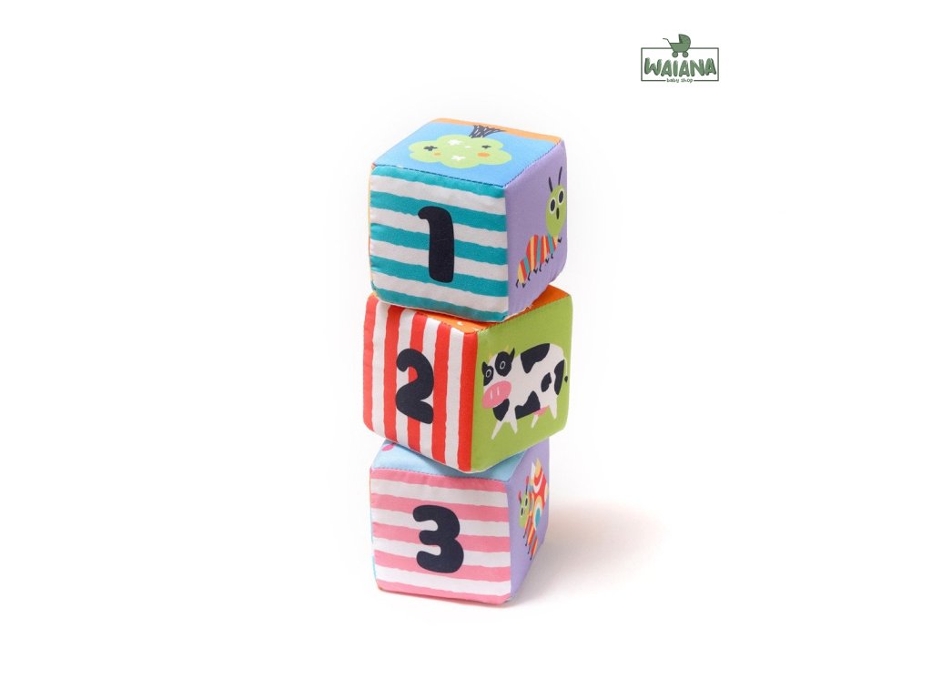 Cieľ: Jemná motorika a uchopenie – Povzbudzujte dieťa, aby chytilo kocky do oboch rúk, čím sa trénuje jemná motorika.Cieľ: Hrubá motorika a hádzanie – Kocky sú mäkké a bezpečné, ideálne na to, aby sa ich deti učili hádzať a skúšali nové pohyby.Cieľ: Kognitívne zručnosti a učenie sa obrázkov – Vďaka obrázkom na kockách sa deti učia rozpoznávať zvieratká, rastliny a bežné predmety.