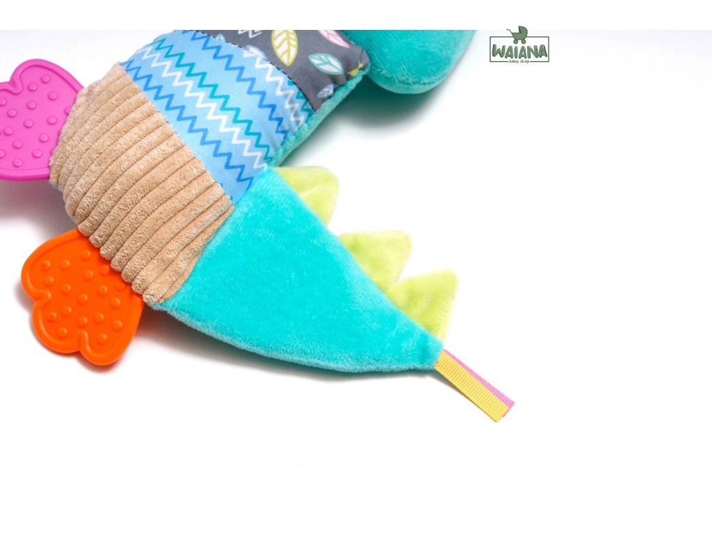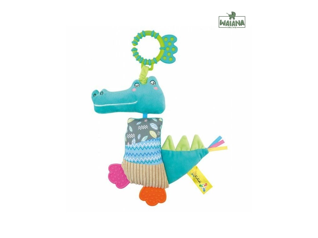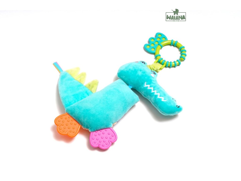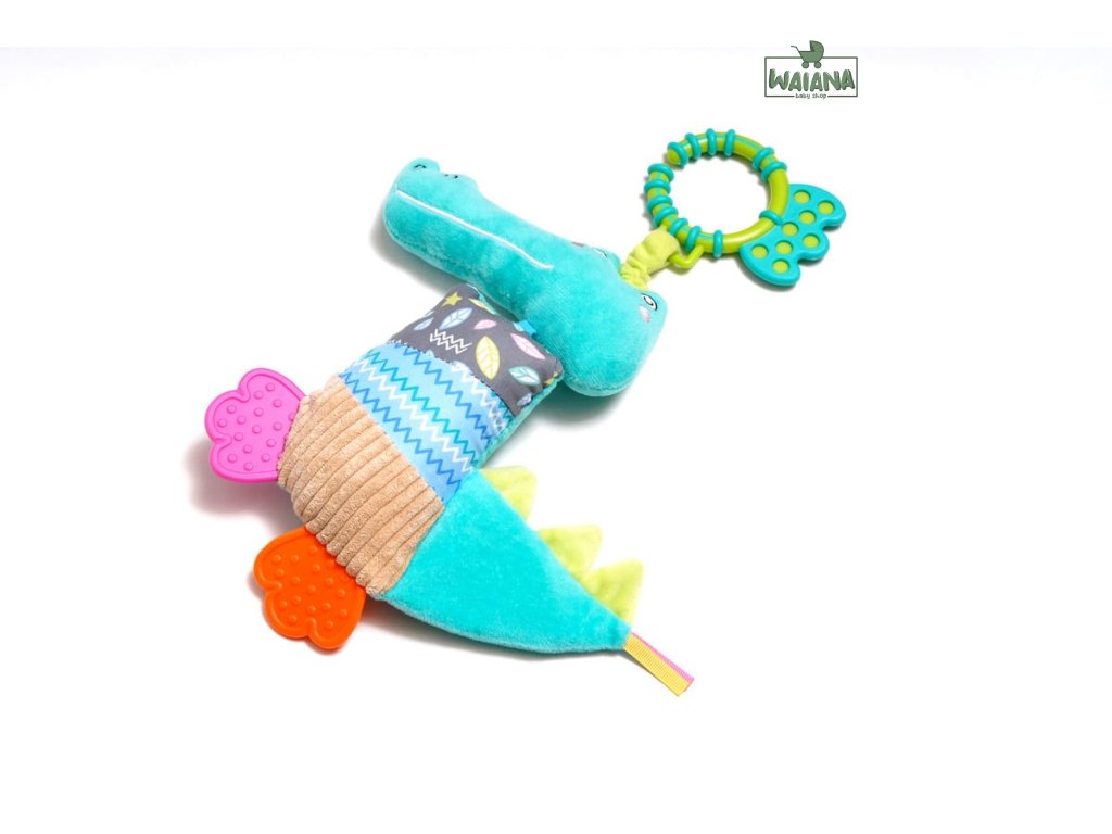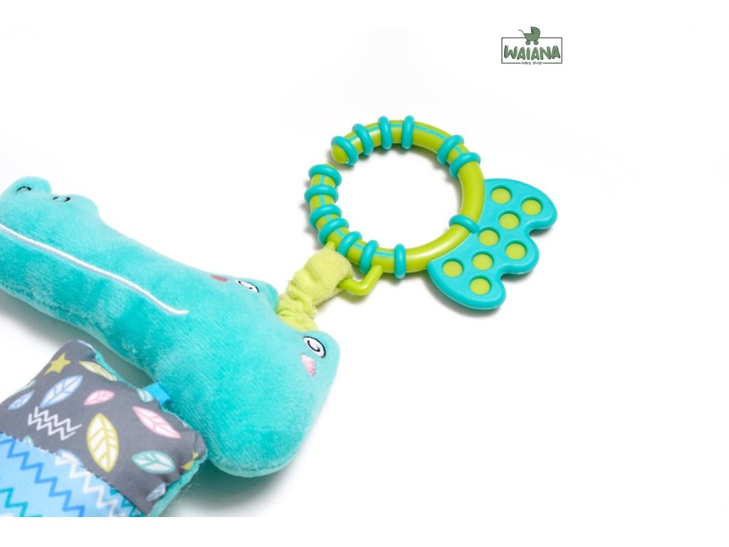 1. fáza (3-12 m): Cieľ: Sluchové a zrakové vnemy – pozorovať reakciu dieťaťa na zvuk.Postup: Vo vnútri prívesku je hrkálka. Rodičia môžu hračkou potriasť a sledovať reakciu bábätka na zvuk tak, že sledujú, ako sa k nej otáča hlavička dieťaťa. Cieľ: Nácvik jemnej motoriky – uchopenieMetóda: Povzbudzujte svoje dieťa, aby chytilo krokodíla jednou rukou a potom druhou. Cieľ: Stimulácia zmyslov – hmat a cit.Metóda: Povzbudzujte svoje dieťa, aby sa dotýkalo rôznych textúr prívesku a hralo sa s hryzátkom. Účel: Upokojenie - najlepší priateľ doma a spoločník na cesty.Postup: Krokodíla je možné zavesiť na akýkoľvek kočík, autosedačku alebo postieľku tak, aby zostal s dieťaťom doma aj vonku.